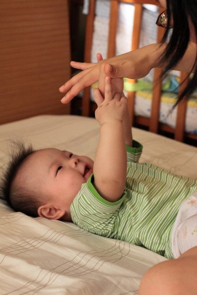當幼兒投入遊戲後,家長的手可放在幼兒的上、下、左、右等不同的位置,引發幼兒向不同方向伸手,以增加遊戲的趣味性。