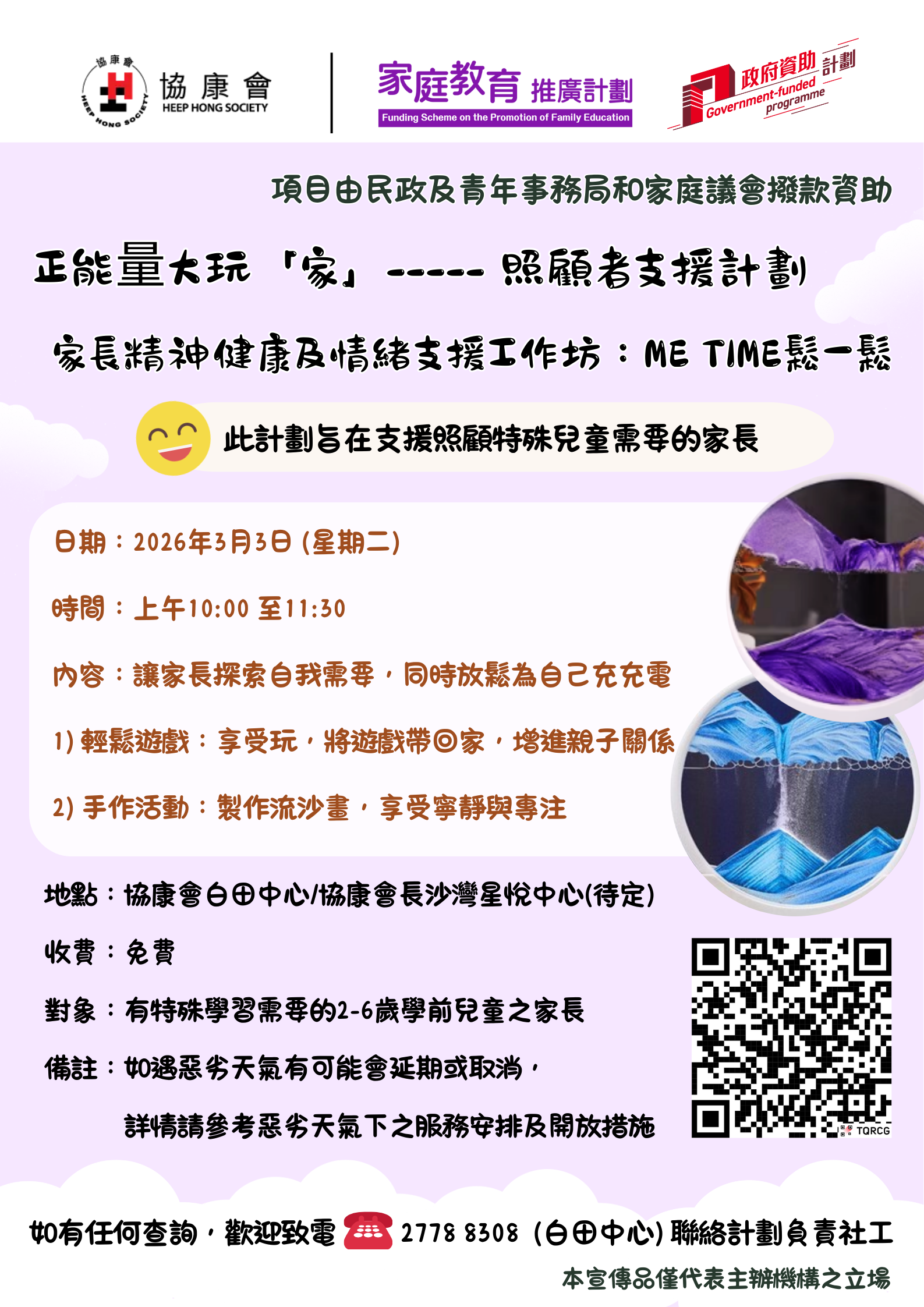 正能量大玩「家」----- 照顾者支援计划(Let’s play! Let’s positive! ---Caregiver Supporting Project)由民政及青年事务局和家庭议会拨款资助,旨在支援有特殊学习需要(SEN)儿童及其家庭
