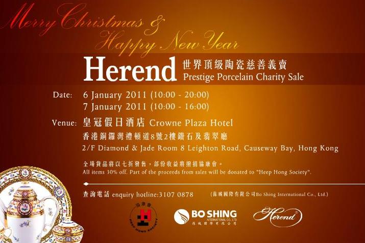 欧洲品牌代理商「葆城国际有限公司」於2011年1月6日至7日,在香港铜锣湾礼顿道8号皇冠假日酒店2楼钻石及翡翠厅举办「世界顶级陶瓷Herend慈善卖物会」,超过300件港币千元以上的顶级陶瓷将以七折发售,部分收益将拨捐协康会,帮助有特殊需要儿童及其家人。诚邀您参与! 查询请电:3107 0878 | 网址:http://www.herend.com/