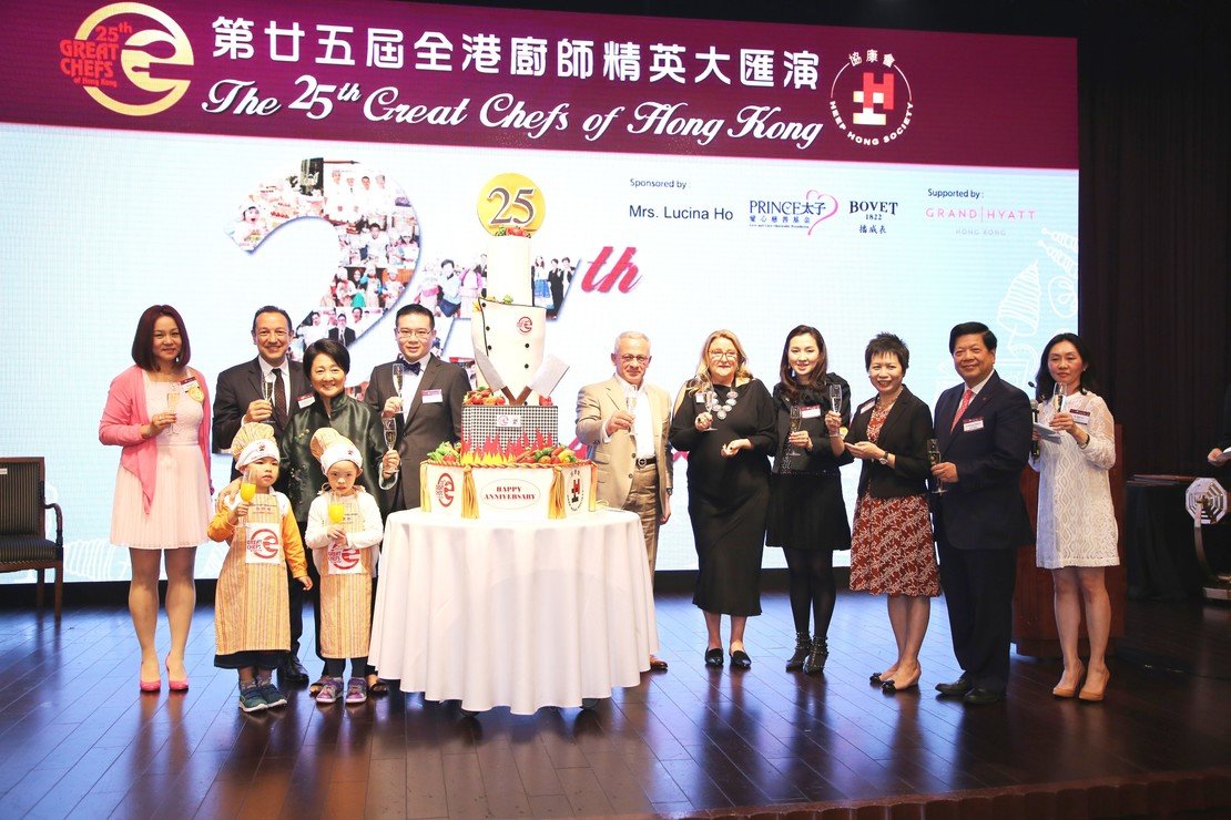 大会赞助人何蓝琼缨女士的代表、香港君悦酒店总经理及区域副总监Mr Richard Greaves、太子珠宝钟表集团副主席及执行董事邓宣宏雁女士、播威1822集团现任行政总裁Mr Pascal Raffy、协康会执行委员会主席欧阳卓伦医生、协康会筹款委员会主席区佩儿女士、协康会总干事曾兰斯女士、「全港厨师精英大汇演」工作小组主席何美凤女士及副主席林李天恩女士,一同为活动揭开序幕。