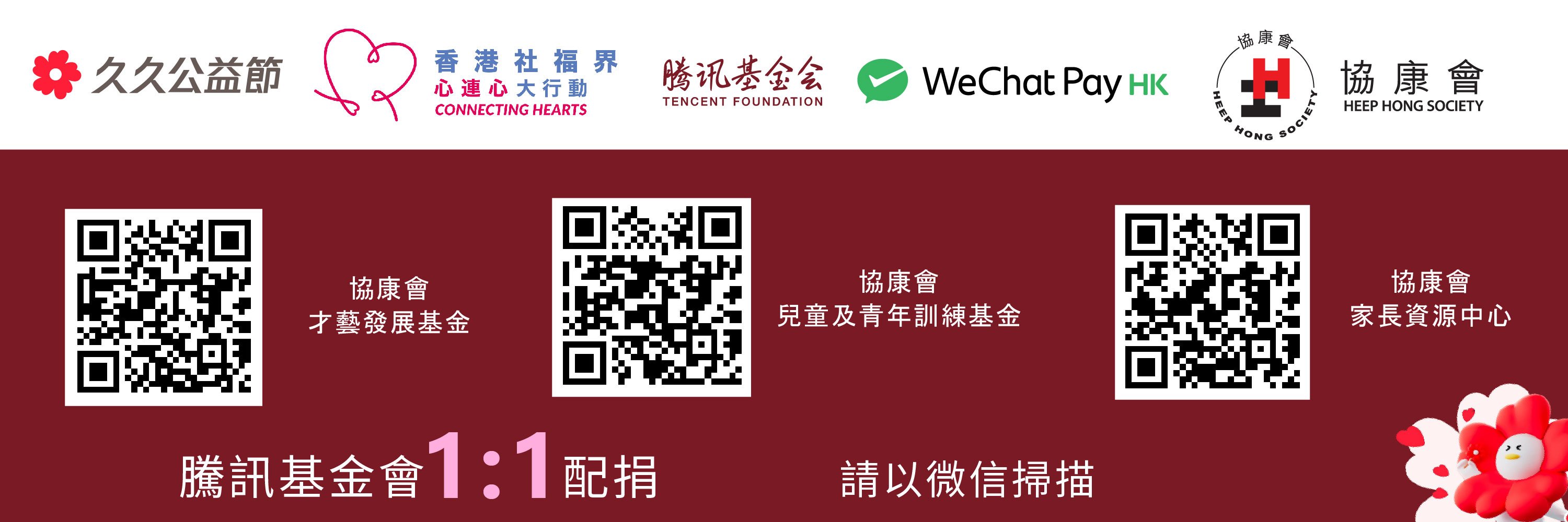 由即日起至9月10日期间,善长於WeChat Pay HK流动应用程式支持本会三个募捐项目,包括:协康会家长资源中心、协康会儿童及青年训练基金,以及协康才艺学校,腾讯基金会便会配捐相对金额,让您的心意加倍!