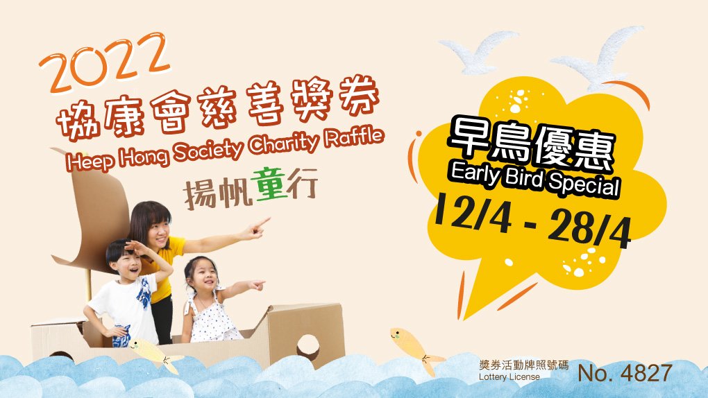在疫情肆虐下,本会预计是次活动收入会因而受影响,致令可拨捐到「家长资源中心」的善款亦会相应减少。故此,希望大众能慷慨支持是次活动,每张奖券只售港币$20,行善之余,更有机会赢取超过300多份奖品。由现在到2022年4月28日,你只要填妥以下的资料,即可享有早鸟优惠,我们会免收您运送奖券的费用!