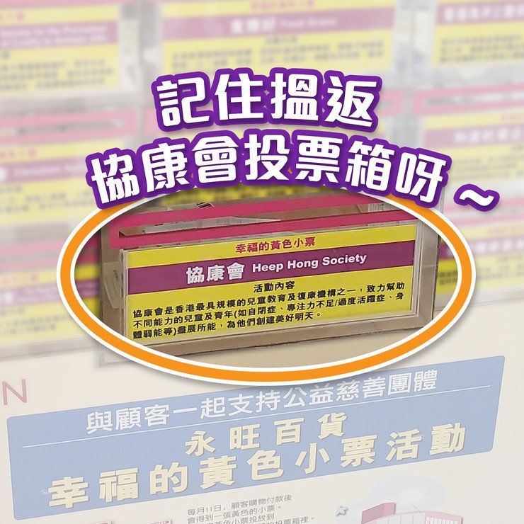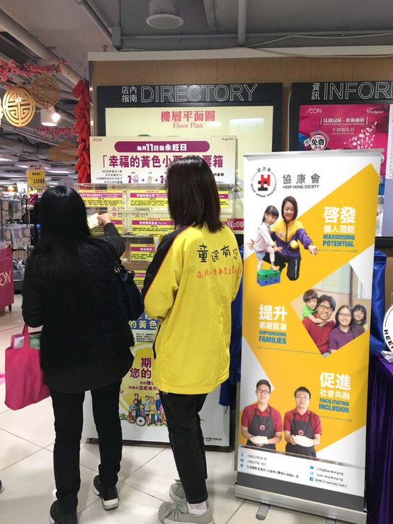 协康会连续第二届获挑选成为AEON Stores永旺(香港)百货有限公司举办的「幸福的黄色小票」活动受惠团体,由今个月起至2020年1月继续参与活动。凡於每月11日到AEON旗下店铺包括AEON、AEON Supermarket、Living Plaza by AEON、Bento Express by AEON、Mono Mono (於地铁站内的分店除外) 购物,付款后会收到一张黄色购物收据,顾客只要将该收据放入店铺外标明「协康会」的投放箱内,AEON永旺百货将根据所收集的收据合计金额的1%,以物资形式捐赠予本会。