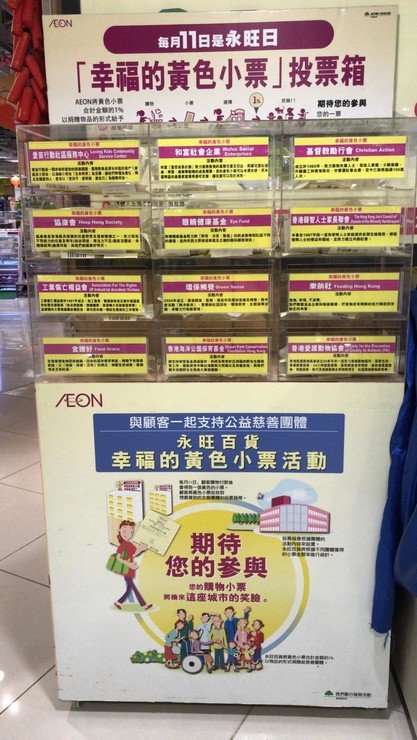 本会将於以下分店设置摊位,向客人宣传「幸福的黄色小票」活动及本会服务。如果你在8月至2020年1月期间的11日会到AEON购物,请多多支持,有机会更可与本会工作人员打打气!摊位日期及详情: