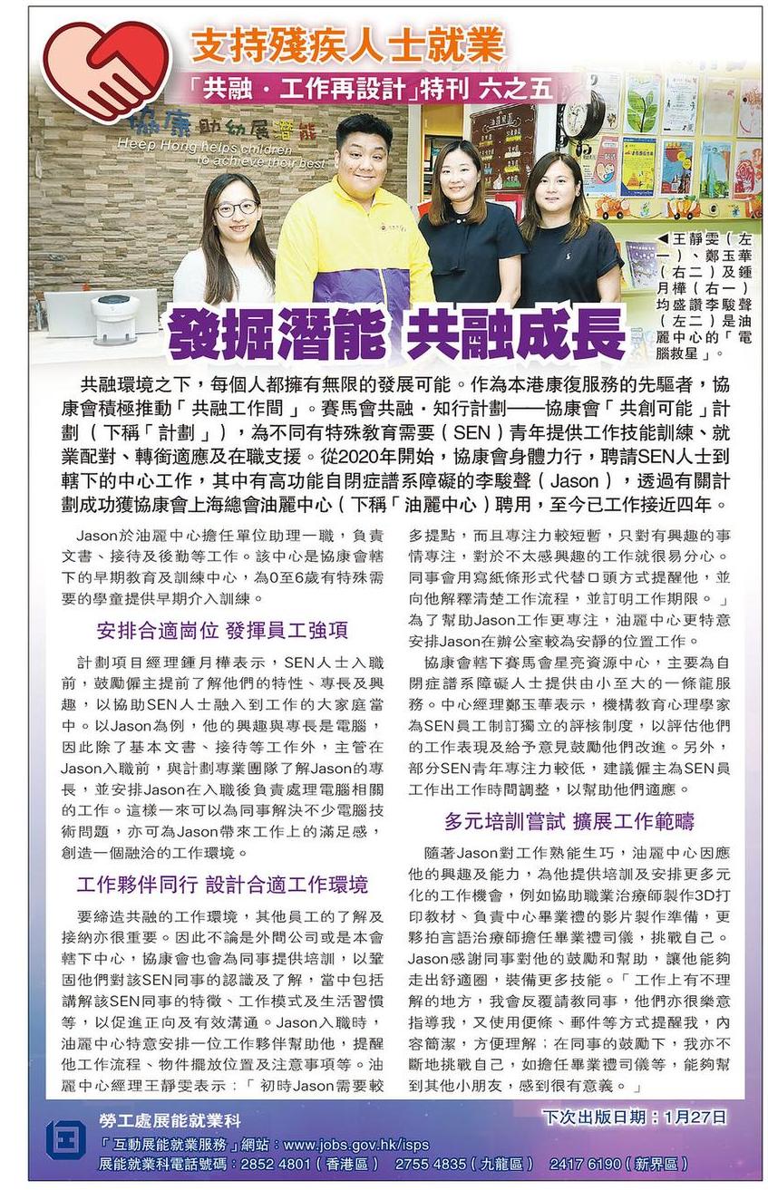 《明报》早前经劳工处展能就业科转介,就「共融工作间」专题访问本会「共创可能」计划项目经理钟月桦(Elsie)、星亮资源中心主任郑玉华(Giselle),并到访本会油丽中心访问计划的学员兼中心助理Jason,及油丽中心经理王静雯(Ada)。
