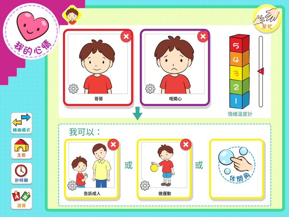 同時,本會更研發「知情解意」應用程式,讓業界同工及家長能更靈活地運用電子教材以支援日常訓練。該程式以生動有趣的動畫介紹20種不同情緒的表情,並配合日常生活情境,以小故事形式講解產生這些情緒的原因和調節情緒方法,對自閉症兒童認識較抽象的情緒概念有莫大的幫助。自閉症兒童在觀察別人的眉頭眼額方面有困難,若能教導他們逐步掌握不同的情緒狀態,有助他們融入主流學習和與人交往。應用程式Android版本已經推出,只需透過Google Play Store,便可以關鍵字「協康會」或「知情解意」搜尋、下載及安裝使用。iPad版亦快將推出,請密切留意本會網頁公佈。