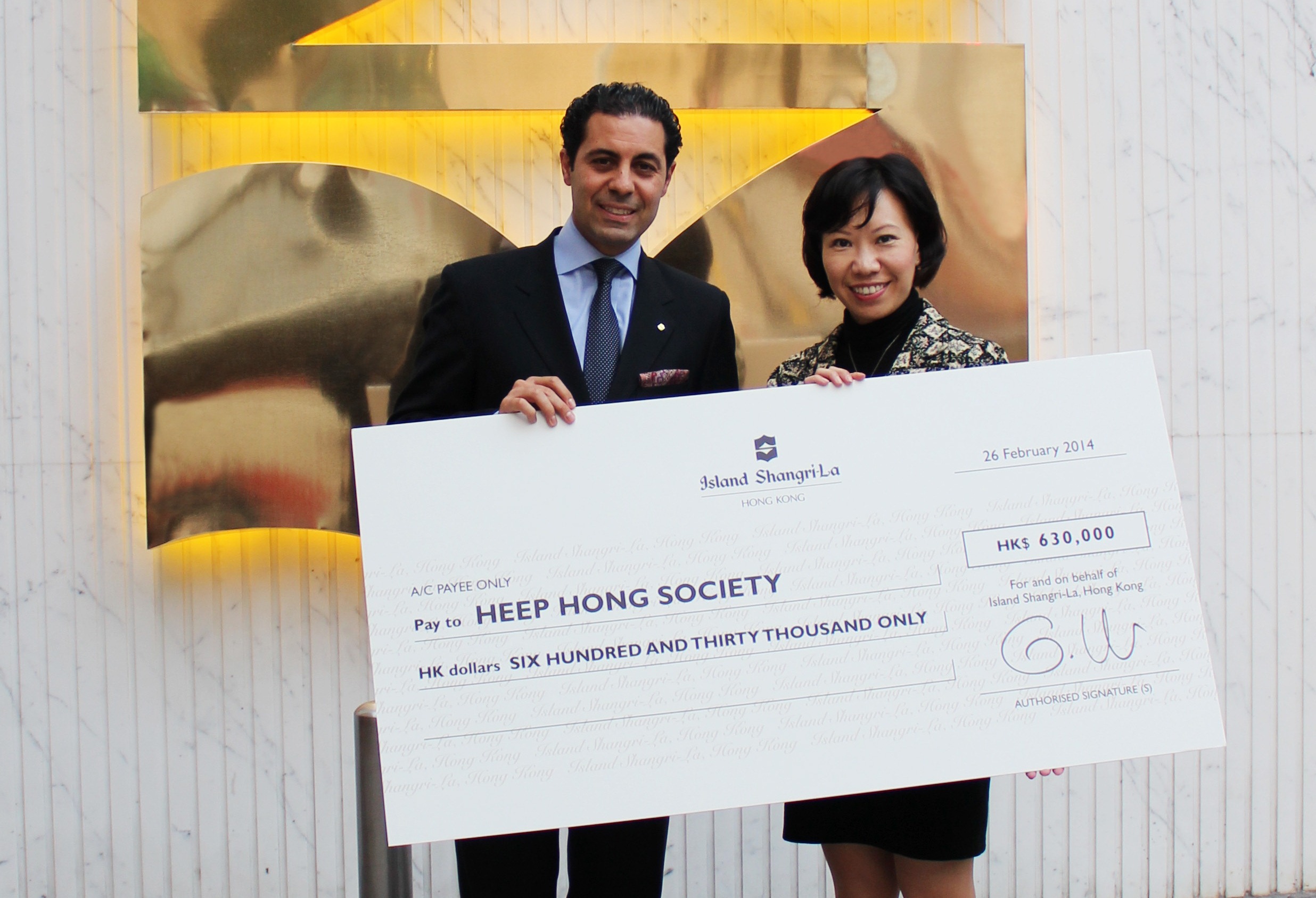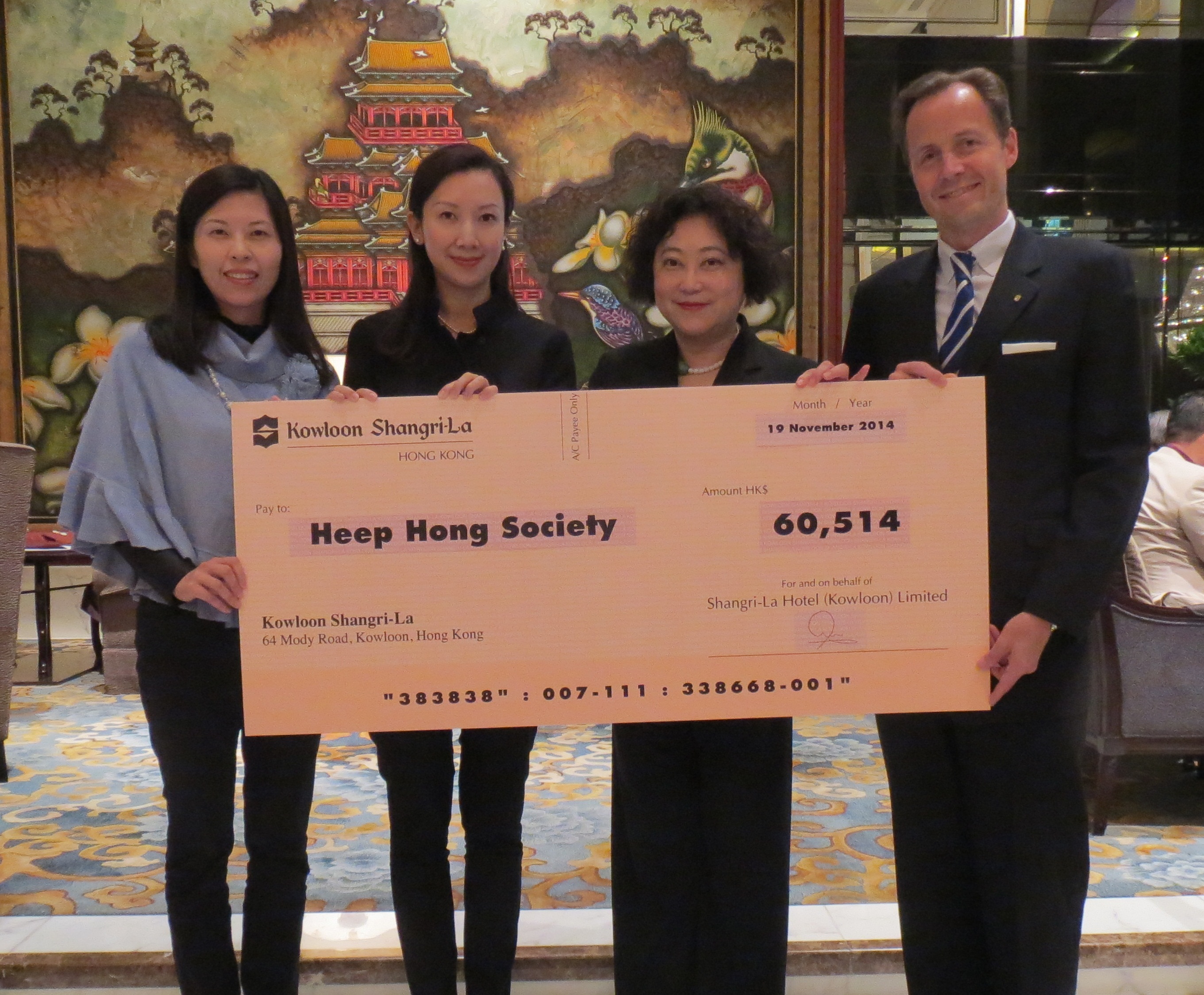 Kowloon Shangri-La, Hong Kong, presented the cheque of donation to Heep Hong Society