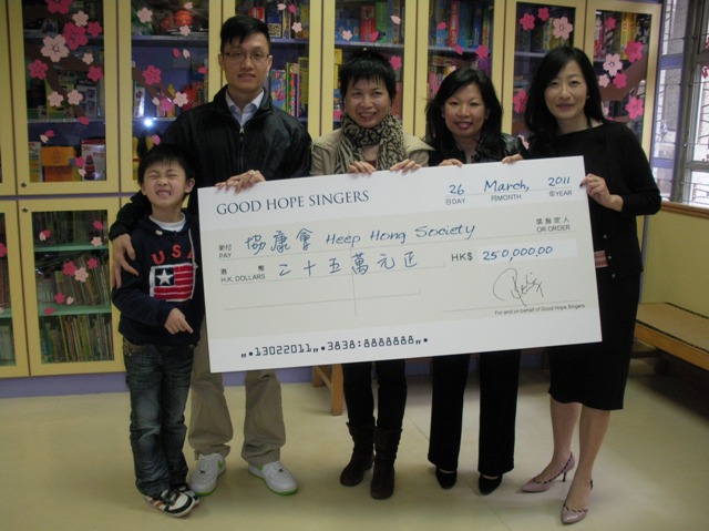 Good Hope Singers made a donation of HK$250,000 to Heep Hong Society on 26 March 2011 for the provision of music group therapies to children with special needs at Heep Hong centres in an effort to improve their analytical, creative, communicative, social, sensori-motor and memory capabilities.