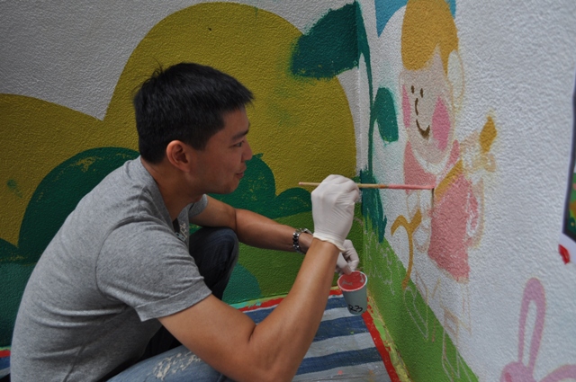 A volunteer of Rotary Club of the Peak part-took in the mural painting at Pak Tin Centre