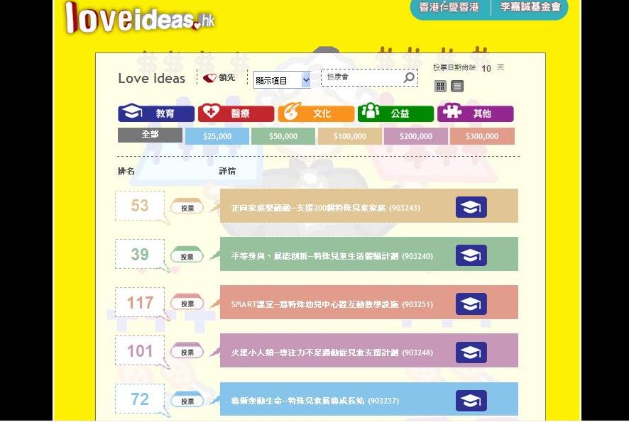 Heep Hong Society submitted 5 projects to the third round of “Love Ideas Love HK” for public voting during 18 June - 8 July 2012. Out of the five projects, “藝術牽動生命─特殊兒童展藝成長站 (Artistic experience for children with developmental problems)” succeeded and received sponsorship of HK$25,000, and “正向家庭樂融融─支援200個特殊兒童家庭 (Positive thinking & social adaptation training for children with special needs & their families)” was picked and sponsored by Mr Li Ka Shing, bringing the total amount of funding to HK$125,000. The other three projects were unsuccessful in the face of stiff competition.