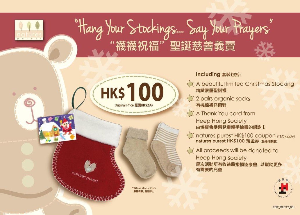 From November 26 onwards, donate HKD 100 to receive a Charity Christmas set ─ a beautiful Christmas stocking with 2 pairs of organic socks, a natures purest cash coupon of HK$100, and a thank you card drawn by our children. All proceeds of this special charity set will be donated to Heep Hong Society, and are available for sale at centres of Heep Hong Society and the following shops of natures purest: