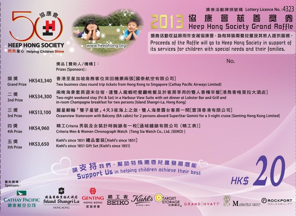In commemoration of the 50th anniversary of Heep Hong Society, Grand Raffle 2013 is held between 12 April and 3pm on 6 June 2013. Raffle tickets are available for sale at a price of HK$20 each at all Heep Hong centres and over 10 different public venues; orders could also be placed online*.