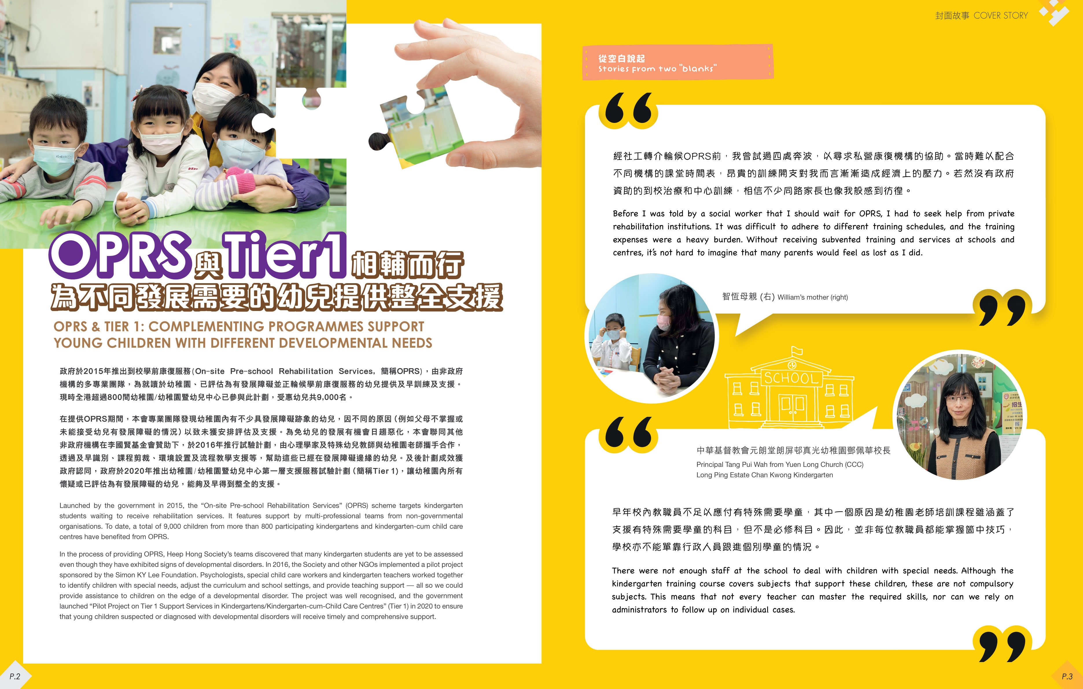 The 60th issue of Heep Hong Express takes a closer look at the challenges faced by mainstream kindergartens in supporting children suspected of having or diagnosed with special needs. It unveils the secret of "On-site Pre-school rehabilitation Services" and "Pilot Project on Tier 1 Support Services in Kindergartens / Kindergarten-cum-Child Care Centres", showing how the two schemes help support these students. In addition, the Society's physiotherapist shares the relationship between the senses and brain development, and introduces parent-child games to promote children's sensory development. In the "Conversations" section, we invited three Heep Hong Society staff members to talk about how they support children and youth with special needs, as well as their families.