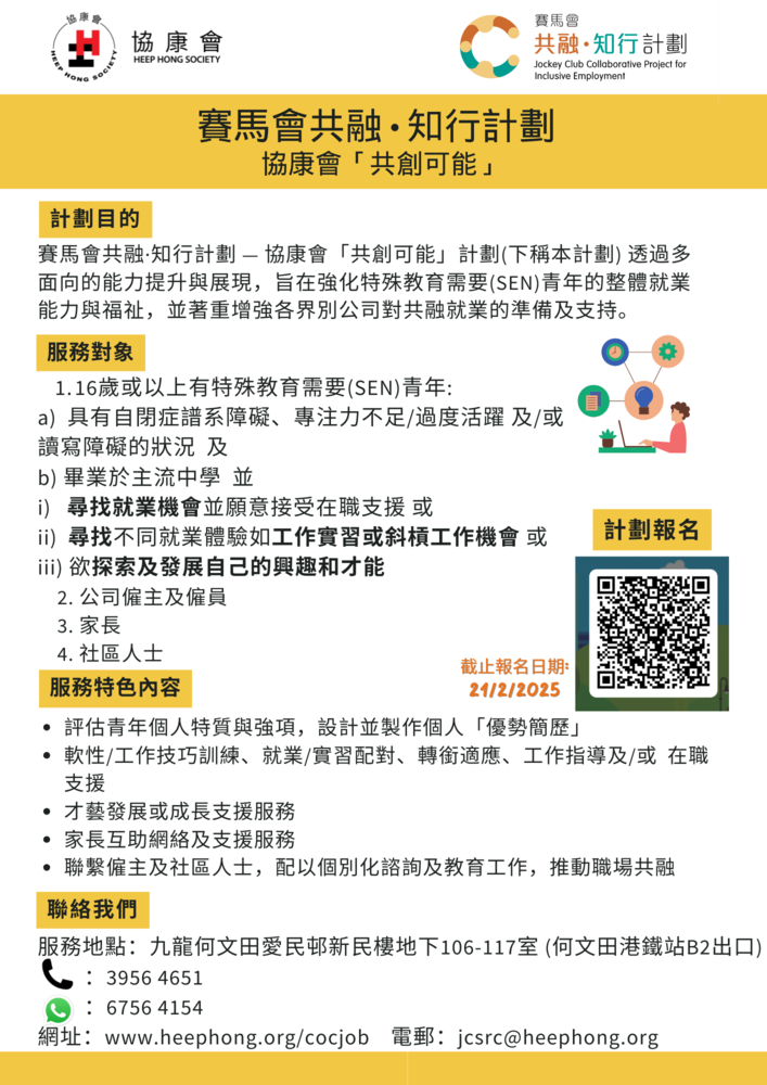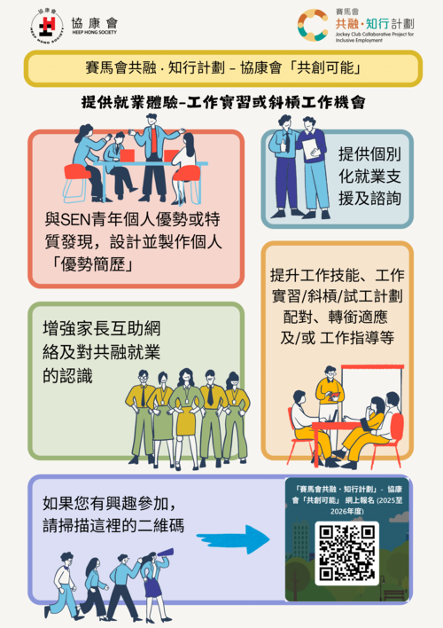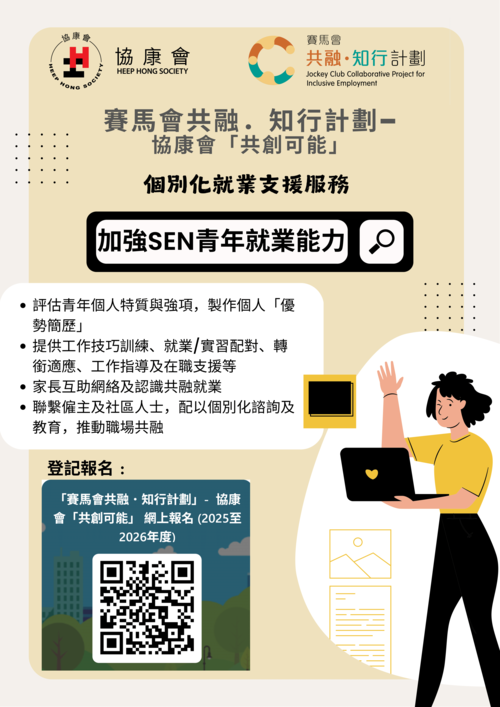 由香港賽馬會慈善信託基金捐助,為期三年的賽馬會共融.知行計劃 – 協康會「共創可能」 (下稱本計劃) 於2024年9月開展第二階段(為期三年),聯同香港大學、香港教育大學及另外五間社福機構,透過多面向的能力提升與展現,旨在強化特殊教育需要(SEN)青年的整體就業能力,並著重增強各界別對共融就業的支持。