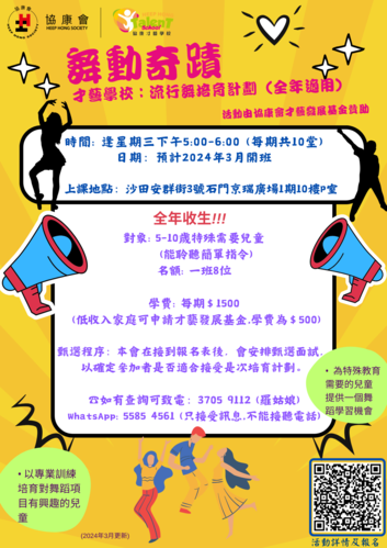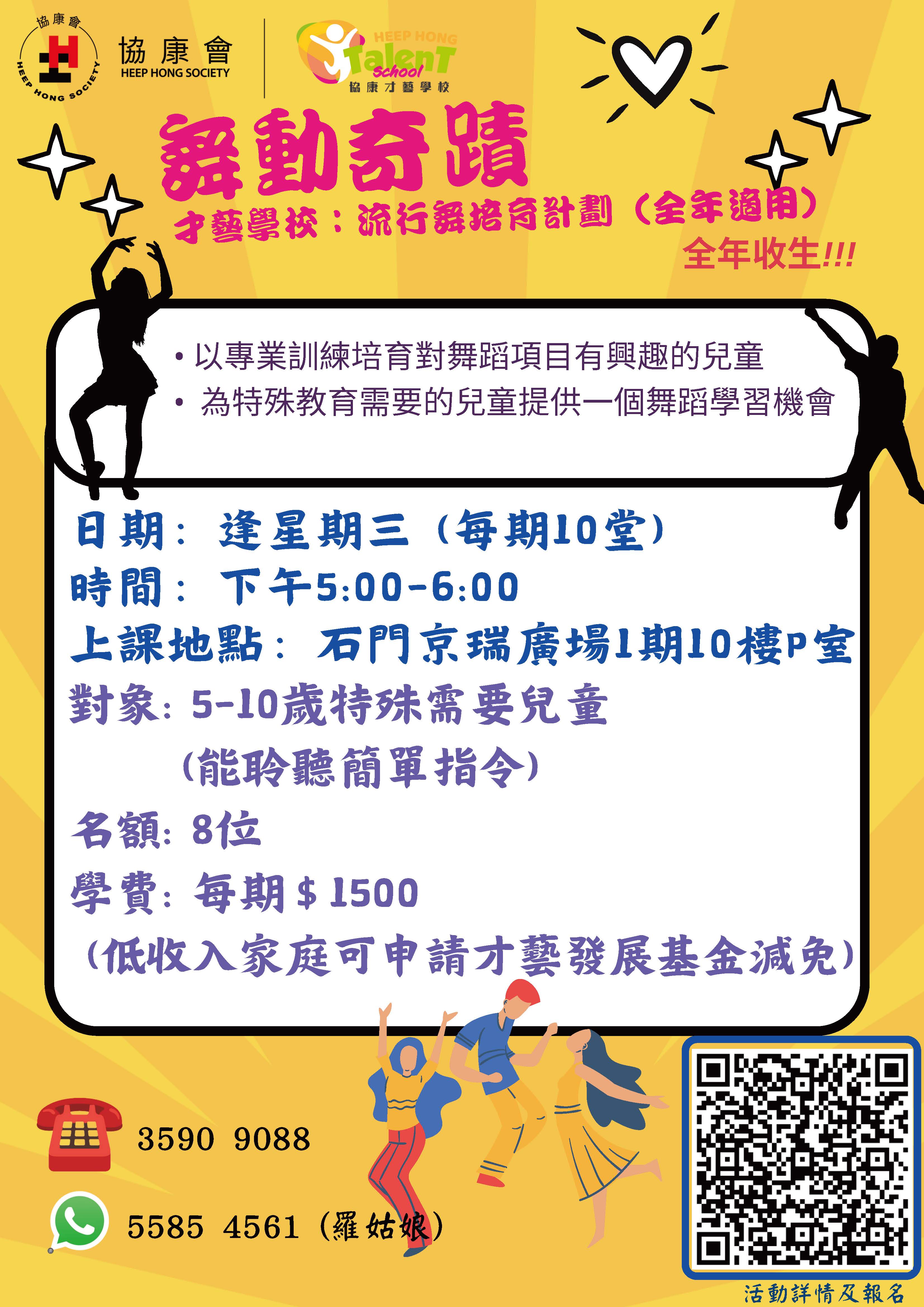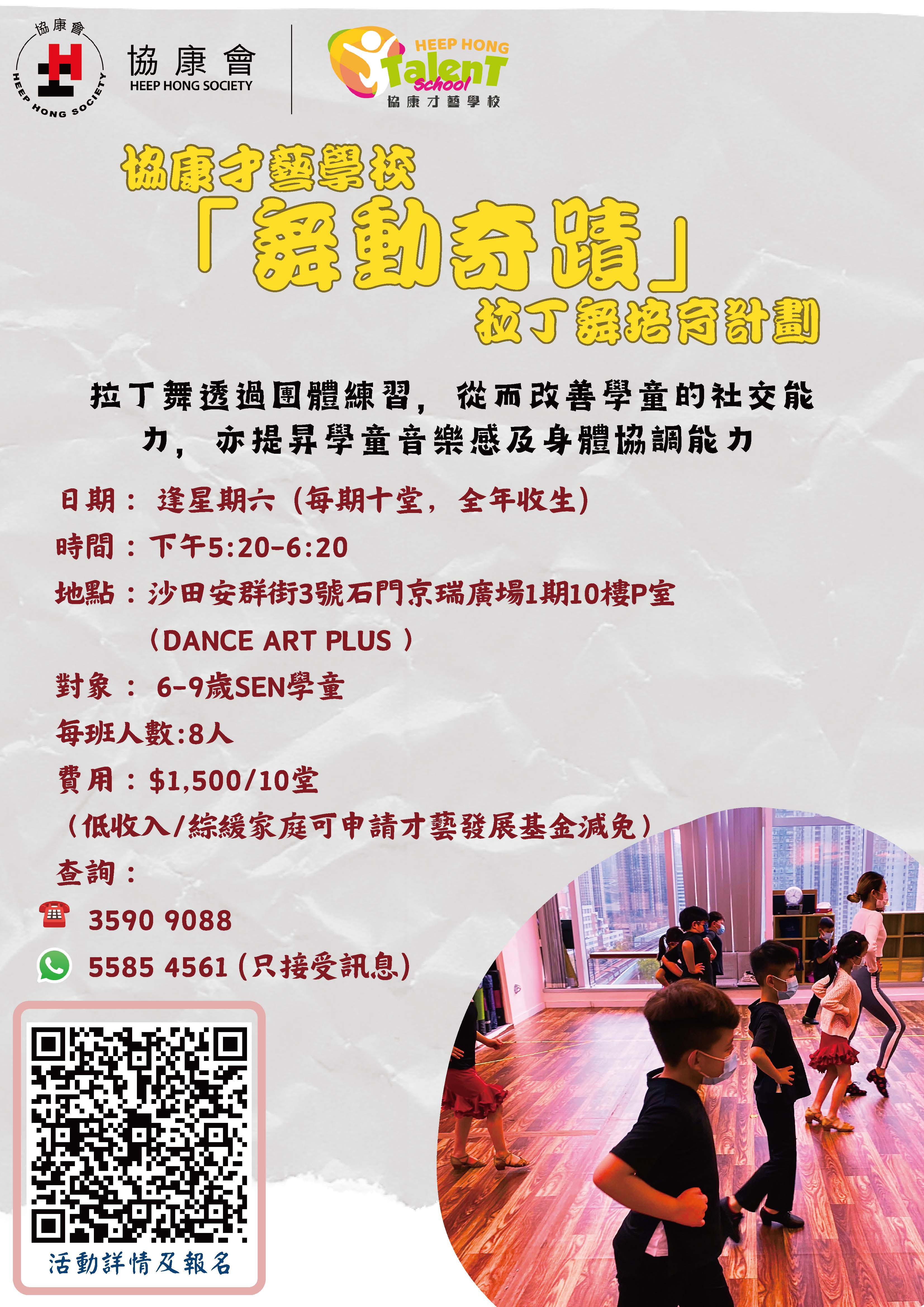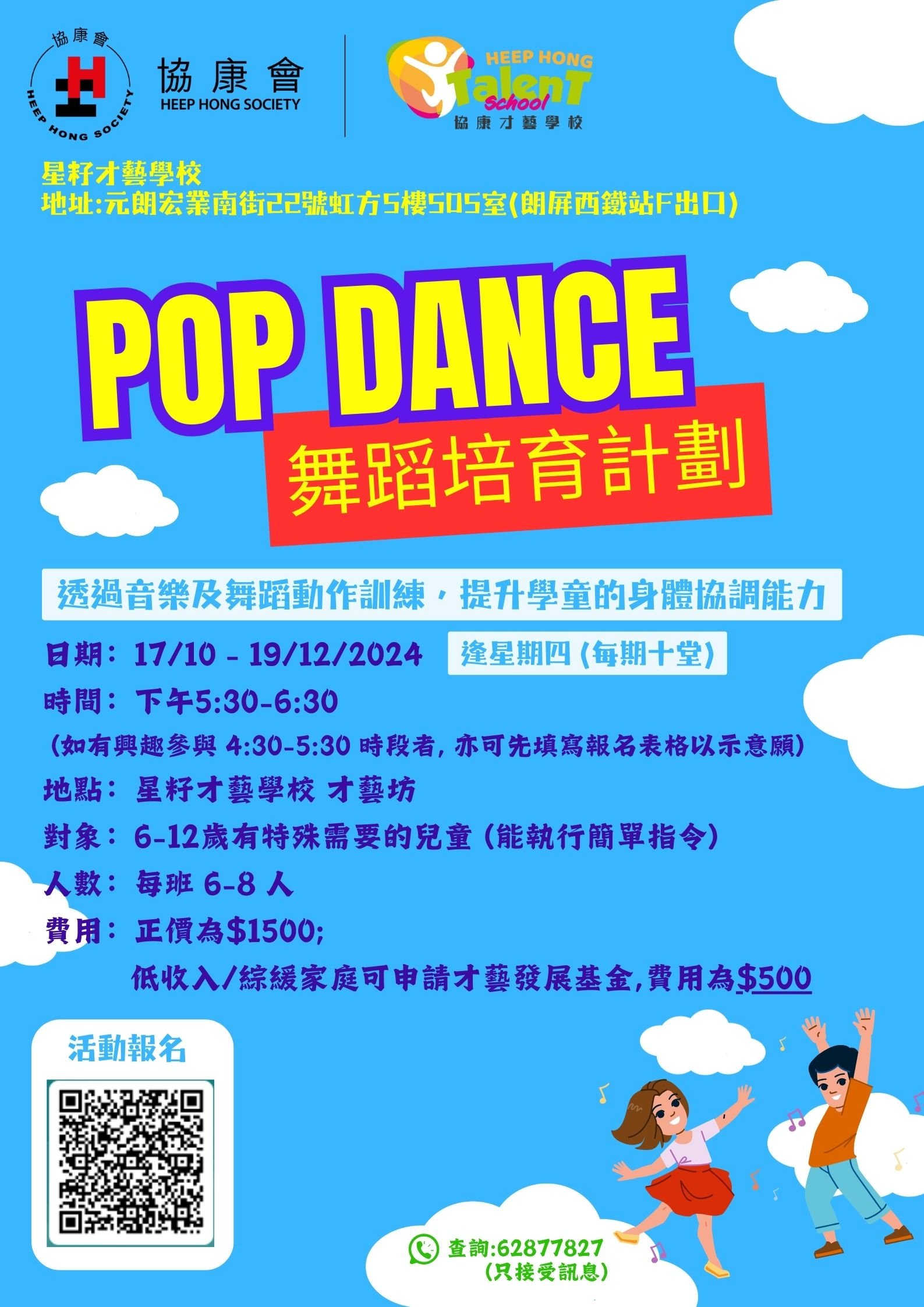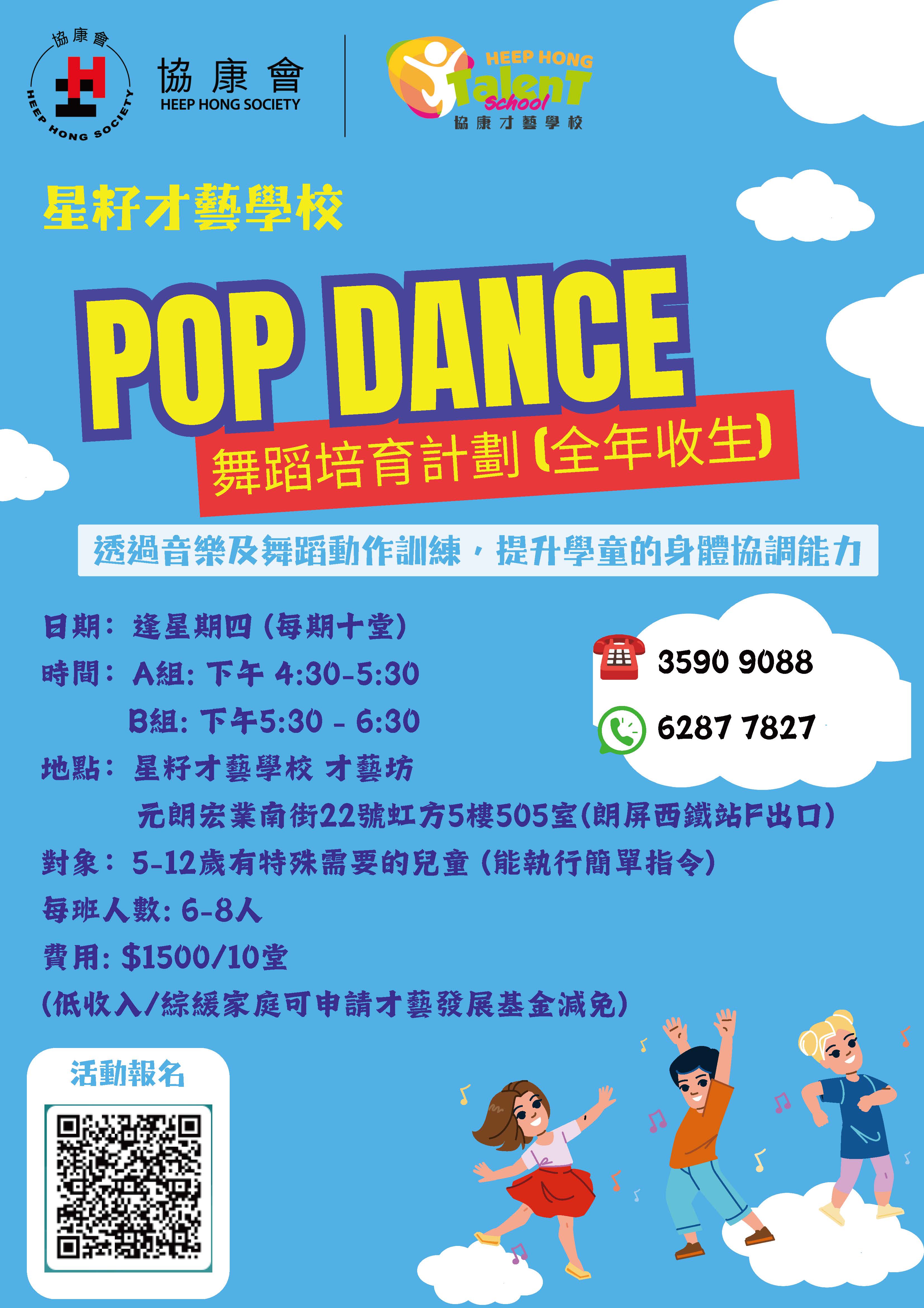 | POP Dance | 透過音樂及舞蹈動作訓練,提升學童的身體協調能力 | 5-12歲SEN學童 |