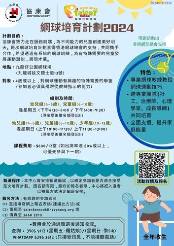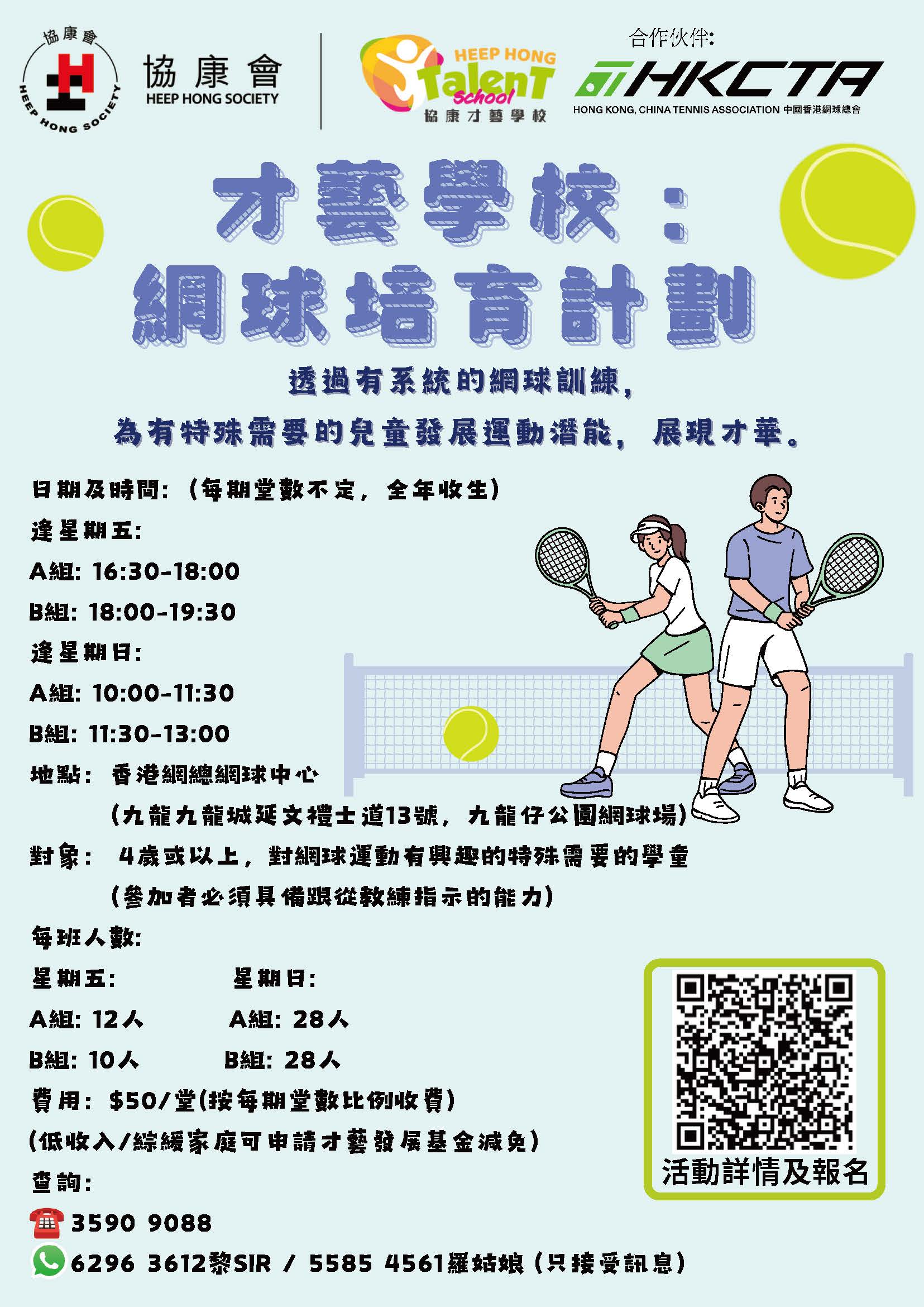 - 運動:我們致力推動多元化的運動項目,包括網球、滾軸溜冰、空手道、桌球、足球及乒乓球,有助兒童及青少年大肌發展、遵守紀律及發展運動技能。同時,運動項目著重體育精神及團體合作,讓兒童及青年學習社交技能,於人際相處會有莫大的益處。