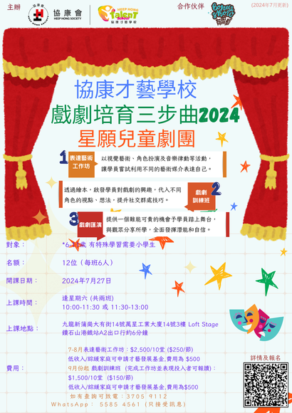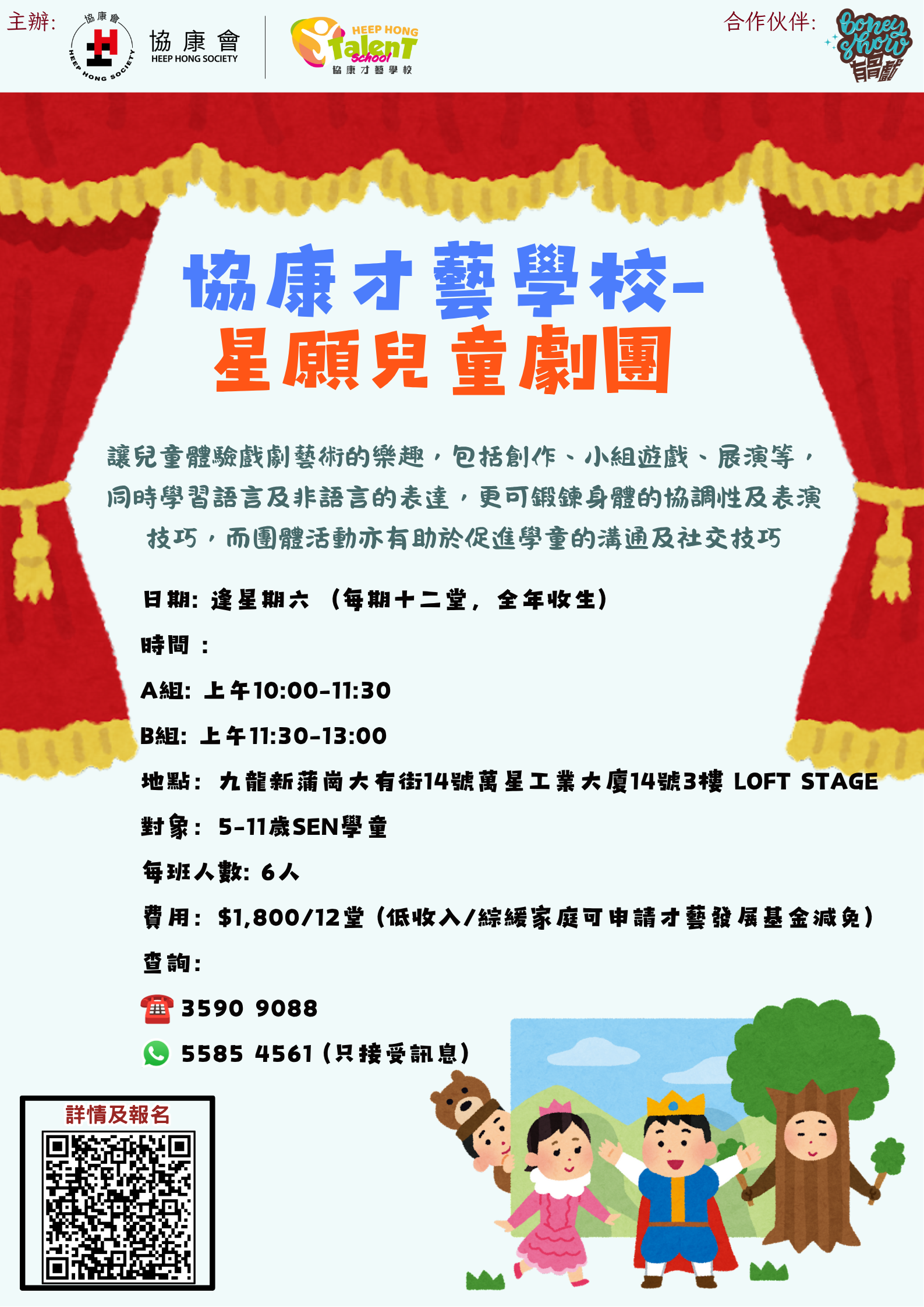 - 戲劇:戲劇著重情感交流,有助語言及溝通能力發展,並建立自尊及成就感。我們現正舉辦戲劇工作坊,讓更多兒童可以接觸表演藝術,甚至有機會踏上舞台,獲得演出經驗,享受表演樂趣並增強自信心。