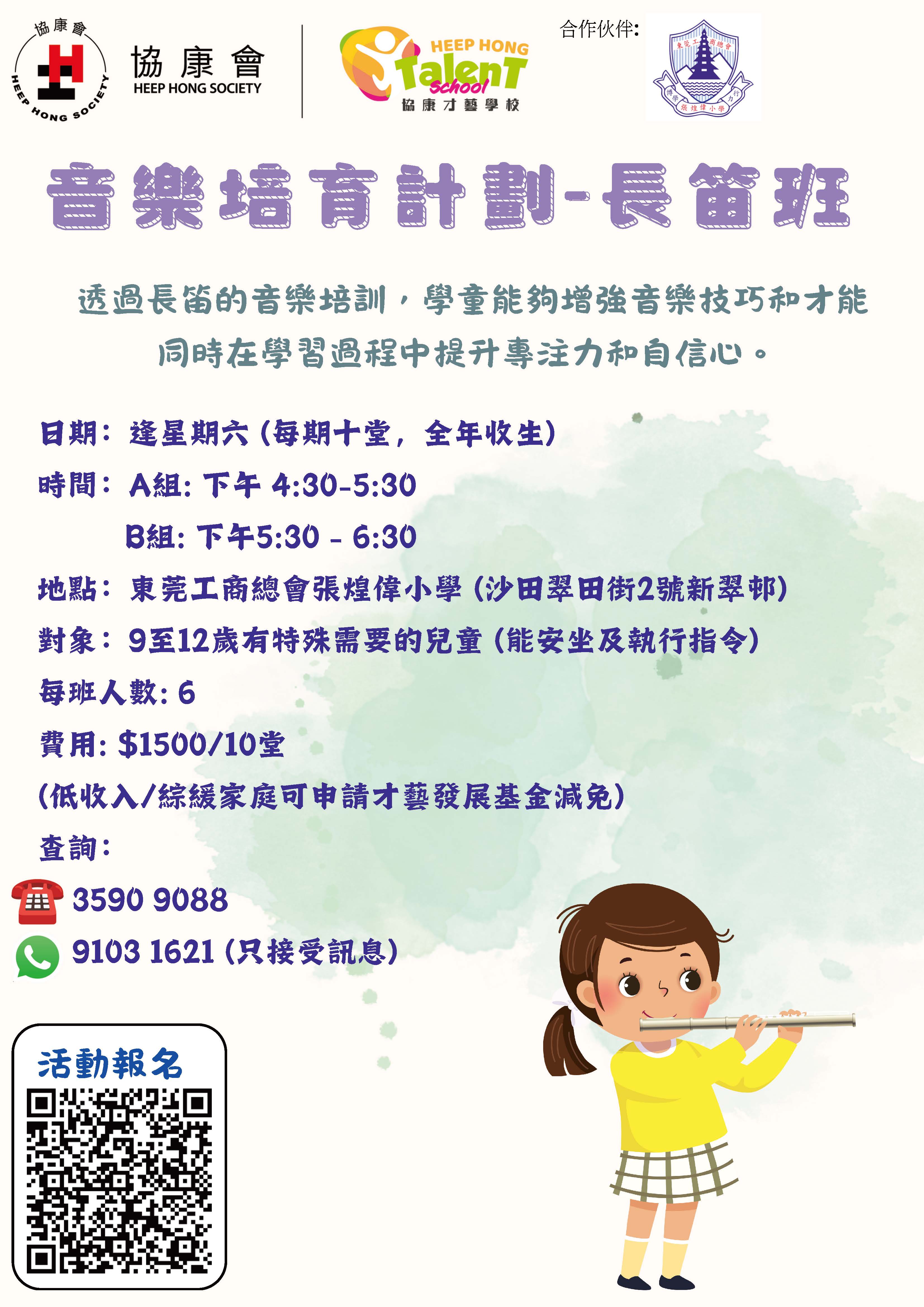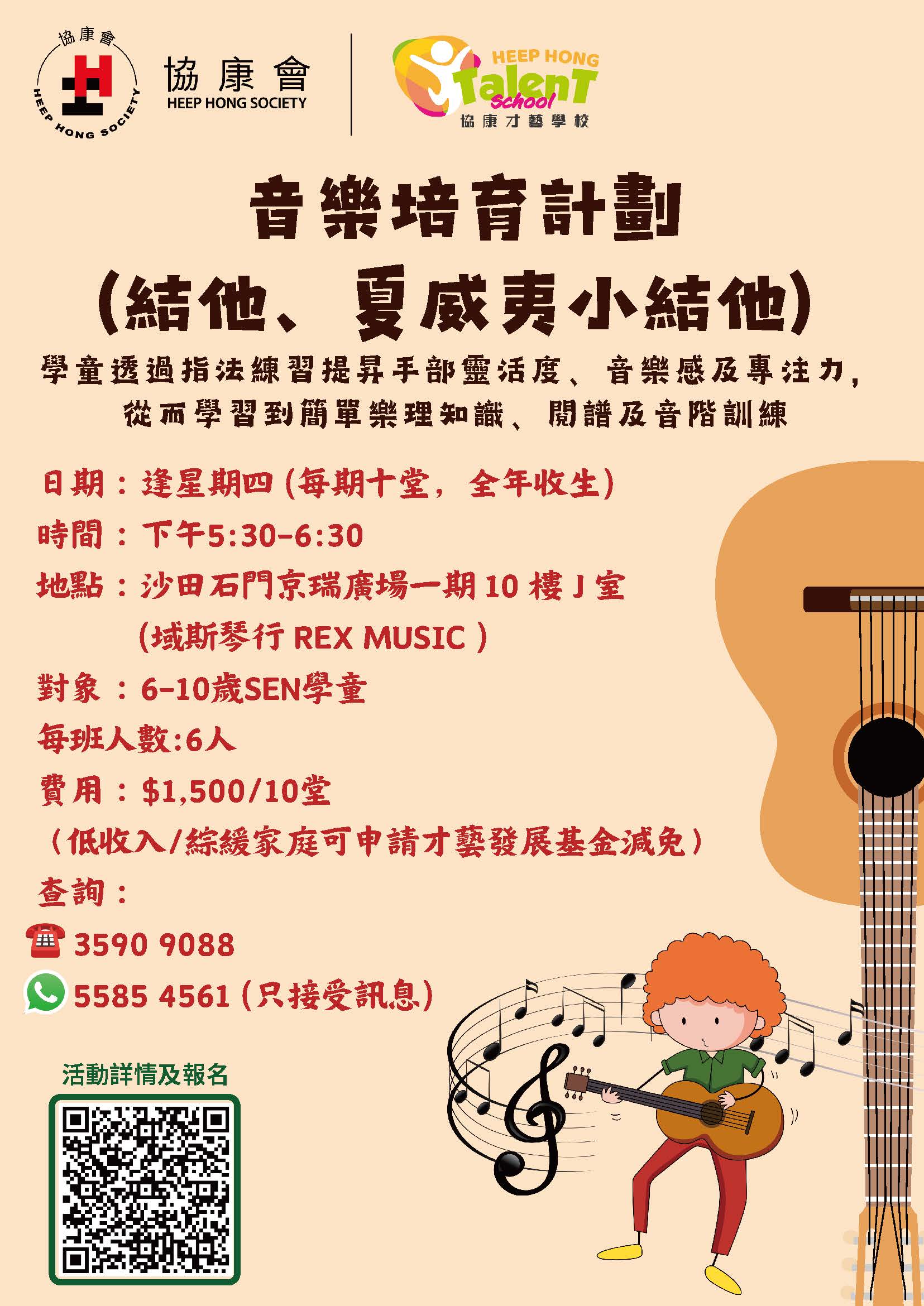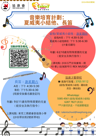 - 音樂:學習樂器需動腦、動手及動耳朵,有助身心協調及提升專注力及記憶力。研究指出,童年音樂經驗能促進大腦發展,尤其在語言學習及閱讀方面。我們現正開辦三類樂器小組課程:夏威夷小結他、長笛及小提琴。