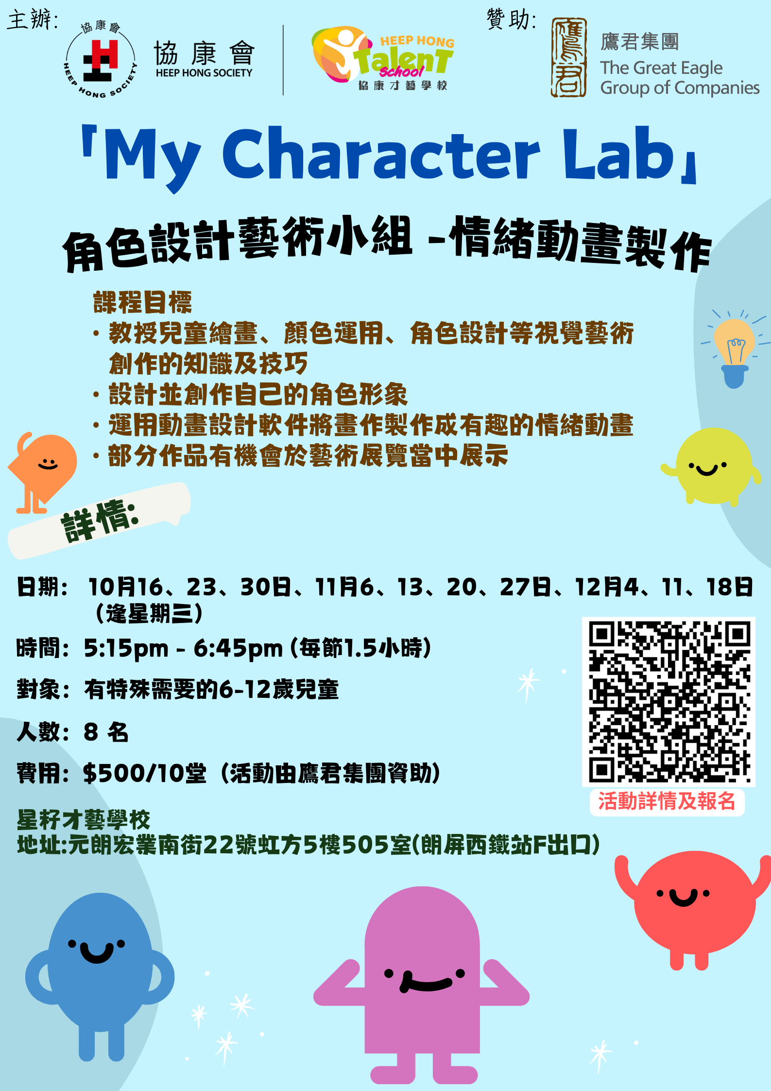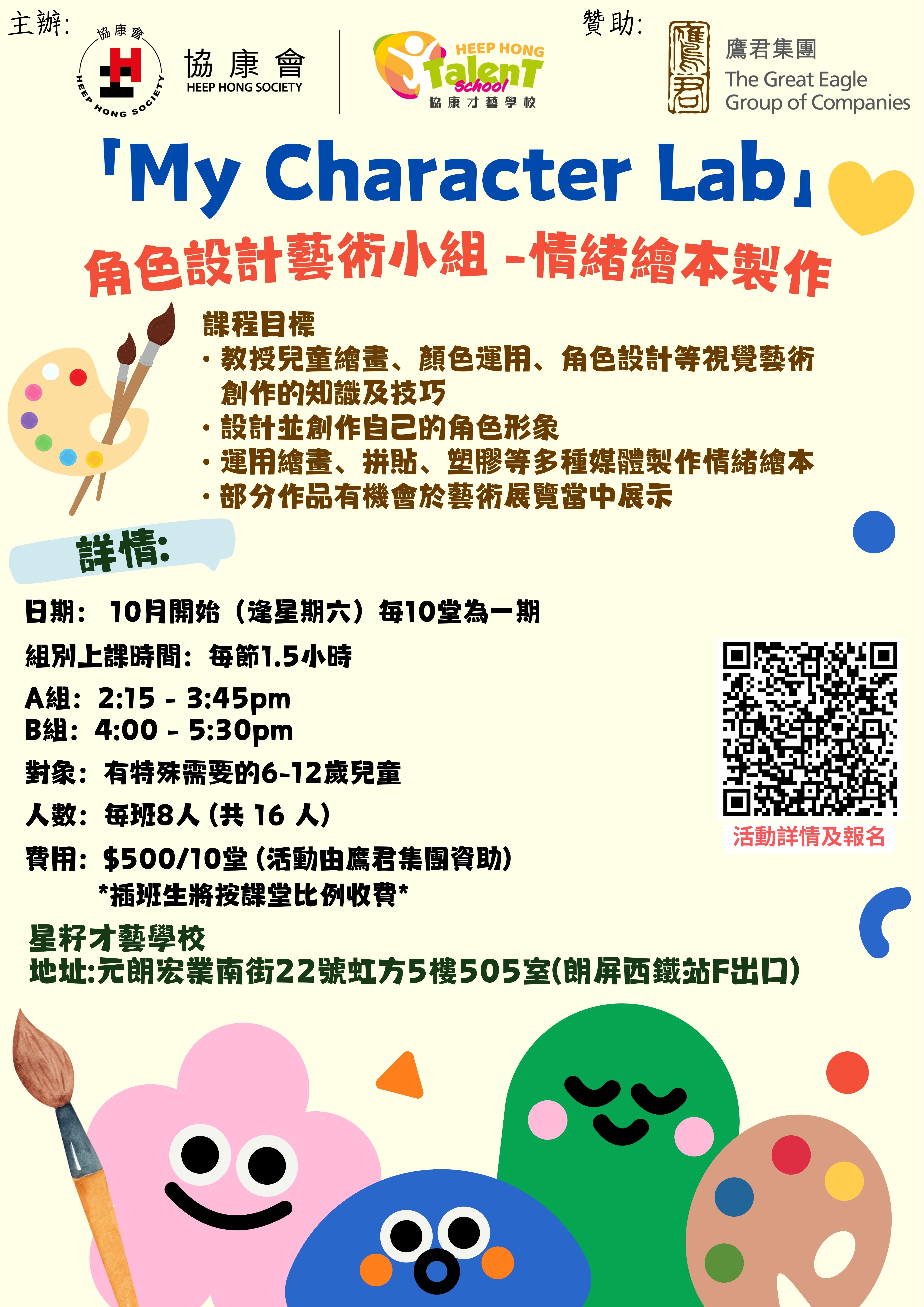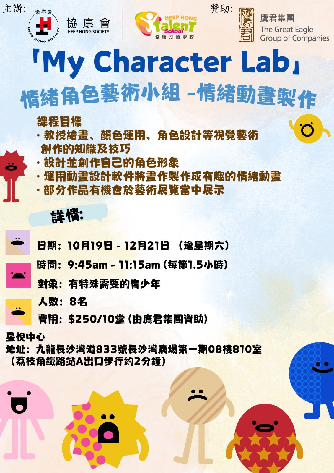 - 視覺藝術:過往曾舉辦日本和諧粉彩培育計劃,首創結合和諧粉彩與動畫製作,激發兒童創意。另外「My Character Lab」情緒角色藝術小組,透過平板電腦製作情緒動畫,融合科技與藝術,展現無限創意。情緒繪本製作小組則鼓勵參加者運用多種物料創作,提升小手肌及手眼協調能力,透過藝術創作表達情感。