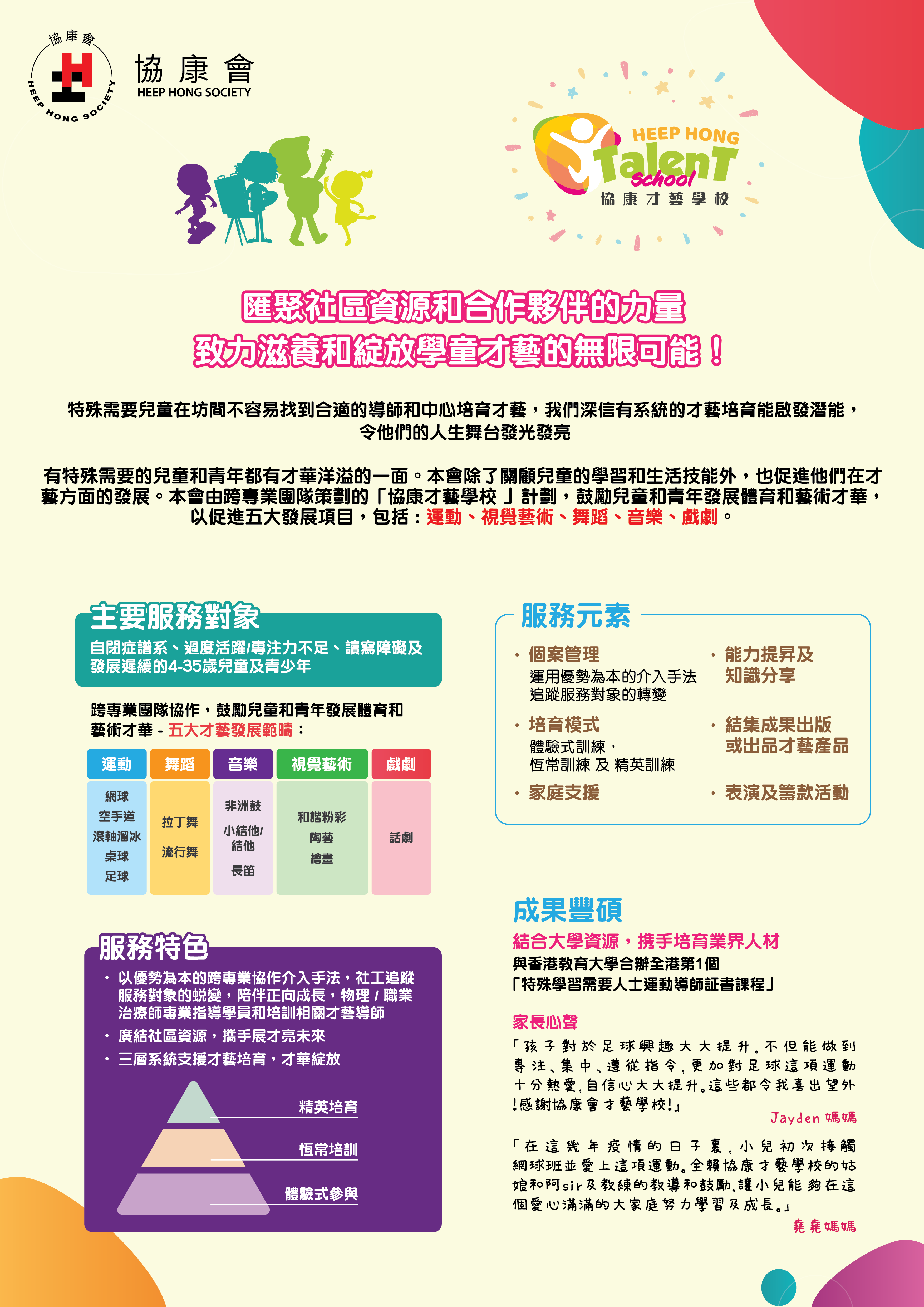「協康才藝學校」由跨專業團隊於2018年策劃,與不同專業的夥伴單位攜手合作,為SEN兒童及青年提供優勢為本的五大發展才藝項目,包括: