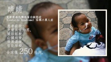 罕有病克斯提洛氏彈性蛋白缺陷症(俗稱小黑人症,Costello syndrome),全球僅有250個病例,晴晴是其中一個患者,徵狀是皮膚黝黑,關節及肌肉鬆軟、發展遲緩等,晴晴出生後不久已不能以口部進食,需要插胃喉來餵食。由於晴晴各種發展出現障礙,後來她進入了協康會特殊幼兒中心,接受言語、物理及職業治療。