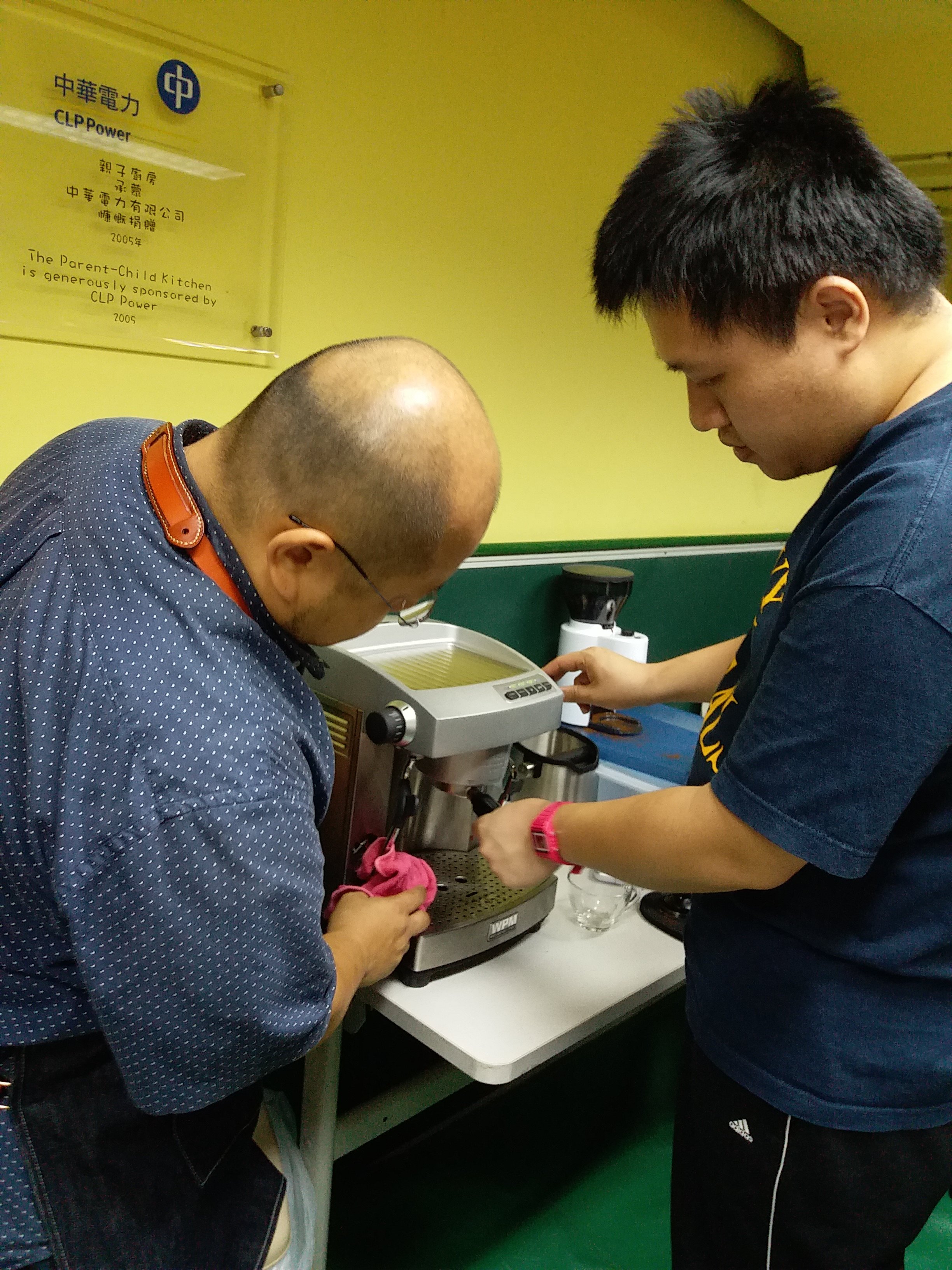學賢在協康會職前訓練工作坊學習咖啡沖調。