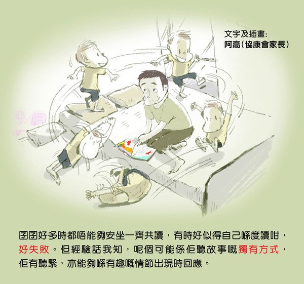 | K: | 一路共讀過程中,孩子很多時都不能安坐在旁一起共讀,有時會好像只有自己在讀,很失敗。但經驗告訴我,這個可能是孩子聽故事的「獨有」方式,他是在聽著,亦能在有趣的情節出現時回應!所以,持之以恆,建立大家一套互動的共讀方式便可以。看到孩子從書本得到快樂,才是真正有意義的目的。 |