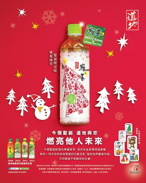 今年聖誕,道地推出蜂蜜綠茶(2013聖誕特別版),把收益一部分捐贈協康會,支援有特殊需要兒童。協康會十多位不同能力的兒童應道地邀請,參與飲品包裝設計,發揮藝術天份,繪畫多款以聖誕為主題的作品,再結合成這款聖誕特別版的包裝圖案,與眾同慶佳節。