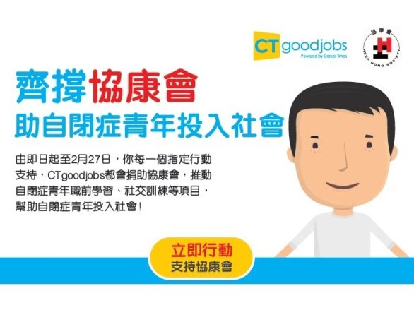 為幫助更多自閉症青年投身社會,融入主流工作環境,協康會與香港招聘網站CTgoodjobs攜手合作,舉辦籌款活動。即日起至2月27日,只要於網上完成下列的指定行動,CTgoodjobs都會捐助協康會,推動自閉症青年職前學習、社交訓練等項目,加深大眾對自閉症青年的了解: