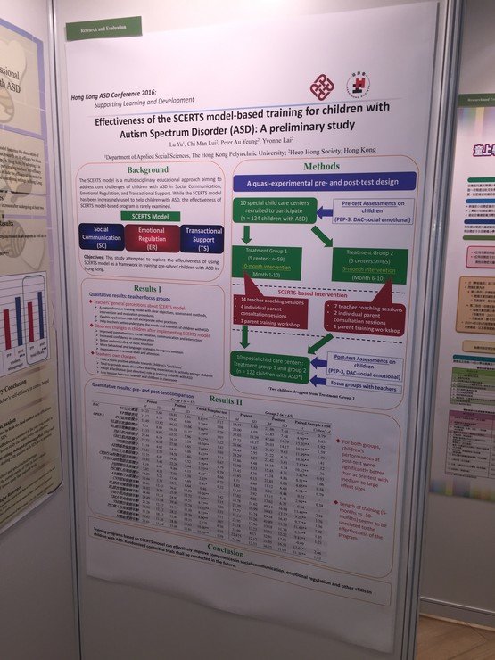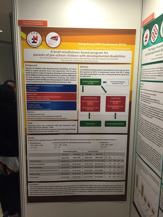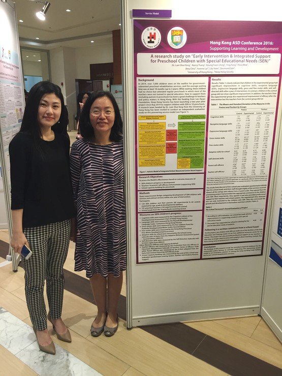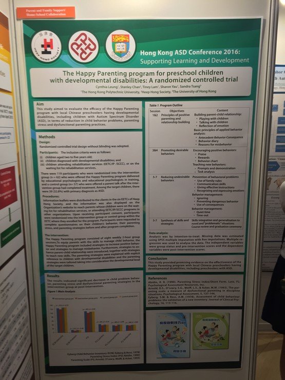 本會專業團隊與多間大專院校積極合作進行研究,五篇論文獲得由「賽馬會喜伴同行計劃」主辦、7月7日舉行的2016香港自閉症研討會:支援學習與發展接納,其中本會三位教育心理學家更獲邀於研討會上主講校本小組訓練的成功要素及介紹「教得其樂–家長管教技巧」課程。