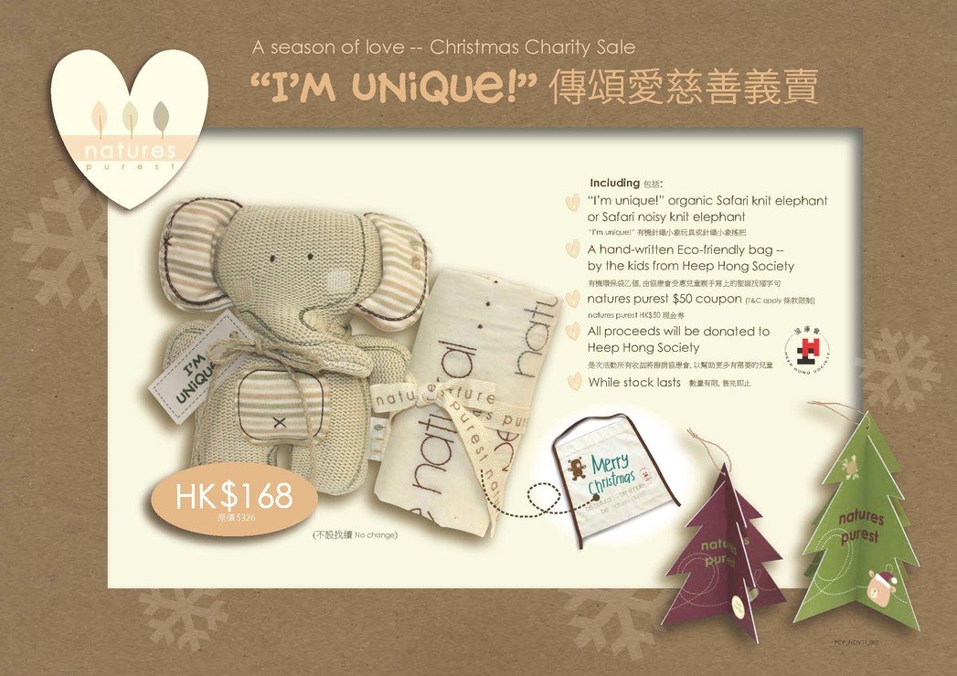 「有機天然彩棉」嬰兒用品專門店 natures purest 舉行「傳頌愛慈善義賣」,包括一隻 "I'm unique!" 有機針織小象玩具、有機環保袋及natures purest $50現金券乙張,所有收益將不扣除任何開支,悉數撥捐協康會,令更多有特殊需要的孩子及其家庭受惠。