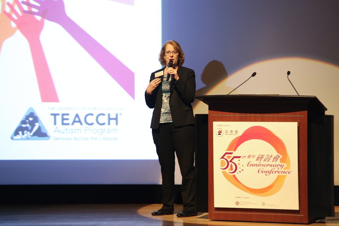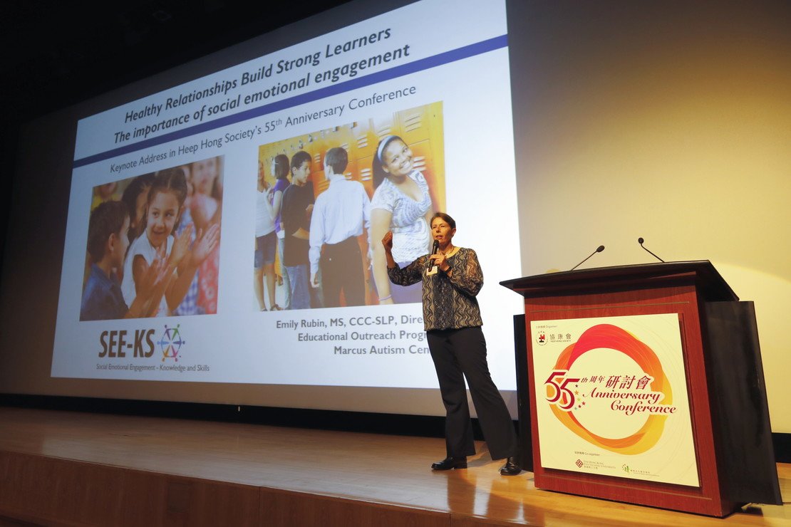 SCERTS模式的合著者Ms. Emily Rubin以「社交情感聯繫對提升學習果效的重要性」為講題,她指出人與人之間的社交聯繫和面對面的溝通都可以有助腦部發展,透過提升社交情感聯繫、利用多元方式為兒童提供資訊,以及鼓勵他們勇於表達情感,都可以讓兒童提升學習成效;而這種社交情感聯繫絕不能以機器人所能取代。」而鄒小兵教授則分享利用最新科技「多模態行為信號採集系統」,可以記錄自閉症兒童的表情、動作、語音以及眼動和生理等資料,並利用大數據分析來尋找自閉症的行為生物標記,有助進行早期篩查。