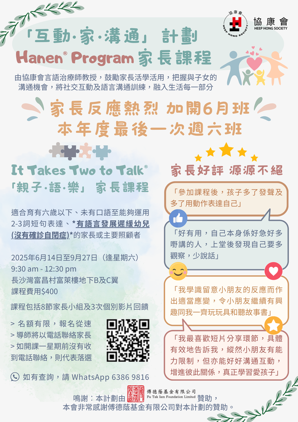 由於反應熱烈,協康會將於2025年6月加開「親子•語•樂」It Takes Two to Talk®家長課程!