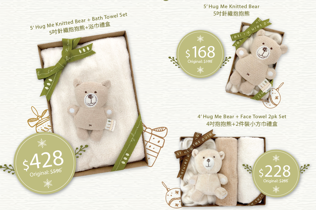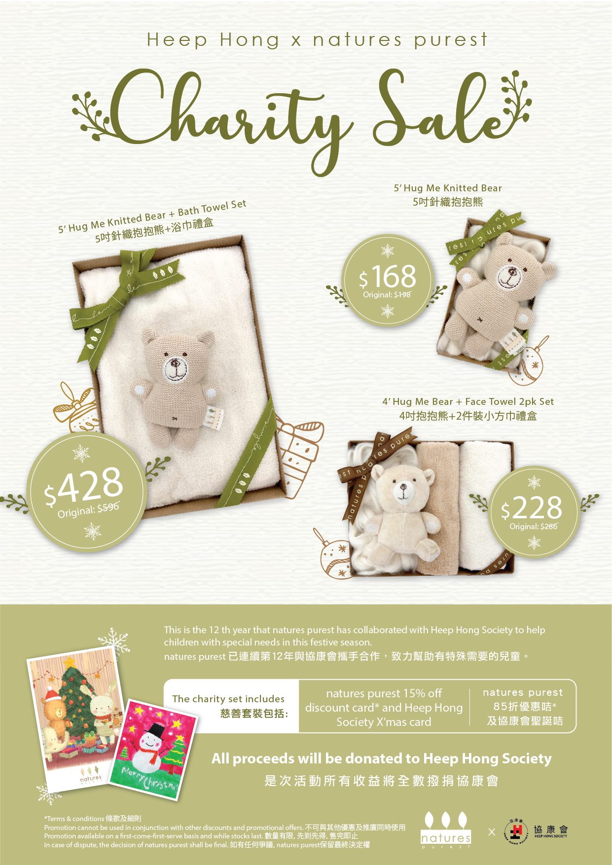 有機天然彩棉嬰兒用品專門店natures purest第12年與協康會推出聖誕慈善義賣,今年特別推出三款抱抱熊聖誕慈善套裝,包括5吋針織抱抱熊(HK$168)、4吋抱抱熊+2件裝小方巾禮盒 (HK$228)及 5吋針織抱抱熊+浴巾禮盒 (HK$428),隨套裝更附送由本會學童繪畫的聖誕賀卡及natures purest八五折優惠卡。慈善套裝在2019年12月1日至31日期間,於以下natures purest門巿發售。數量有限,售完即止。