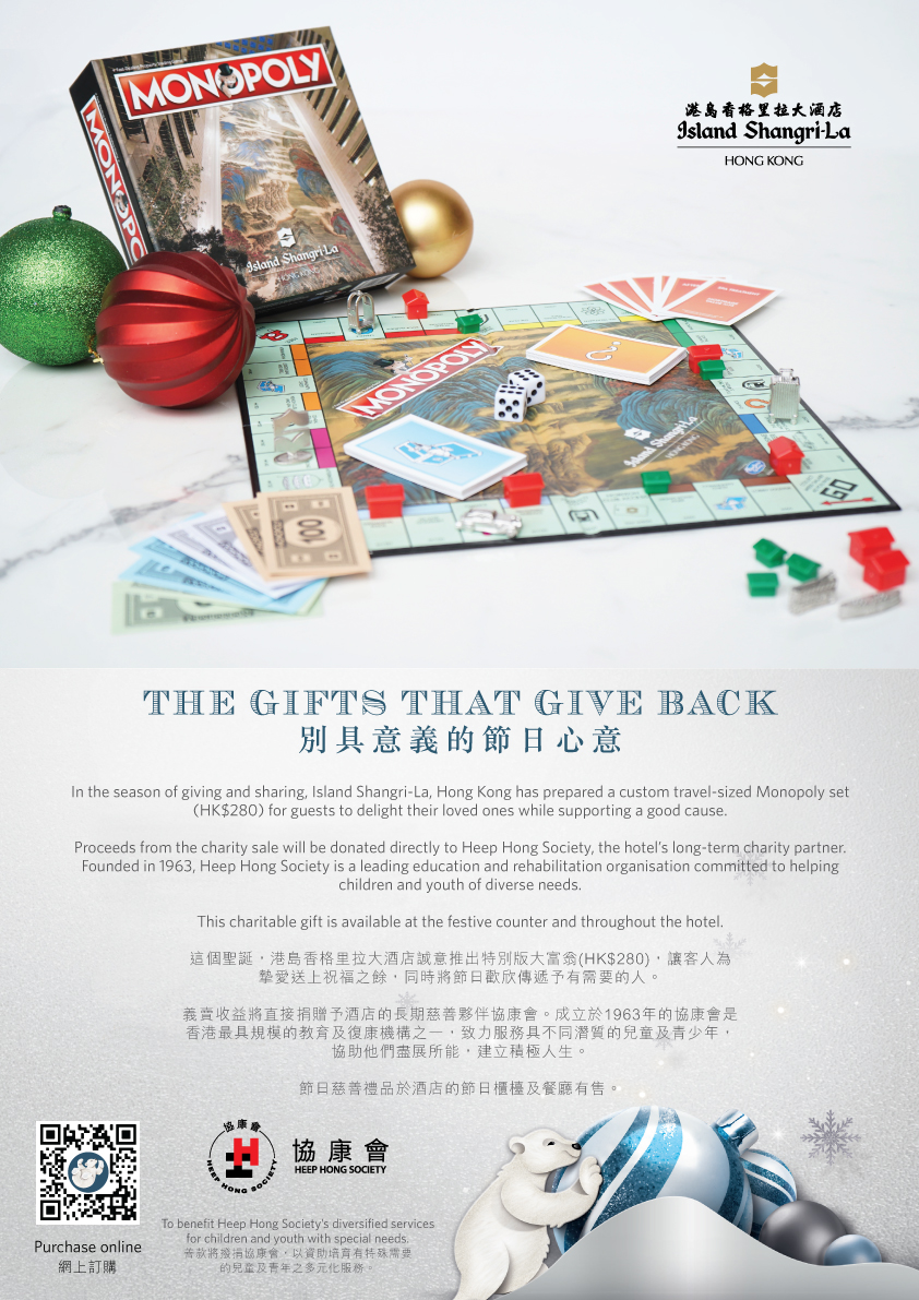 本會長期合作夥伴 - 港島香格里拉大酒店及natures purest今年再度為協康會舉辦慈善義賣活動,分別發售便攜特別版大富翁以及有機天然彩棉針織抱抱熊套裝,所得收益將撥捐本會,部份慈善義賣物品可在協康會轄下中心訂購。