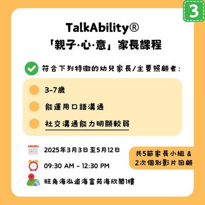 - 教授家長幫助幼兒與他人溝通的實用策略,從而改善幼兒的對話能力、明白別人的意思、提昇幼兒的彈性思維能力等