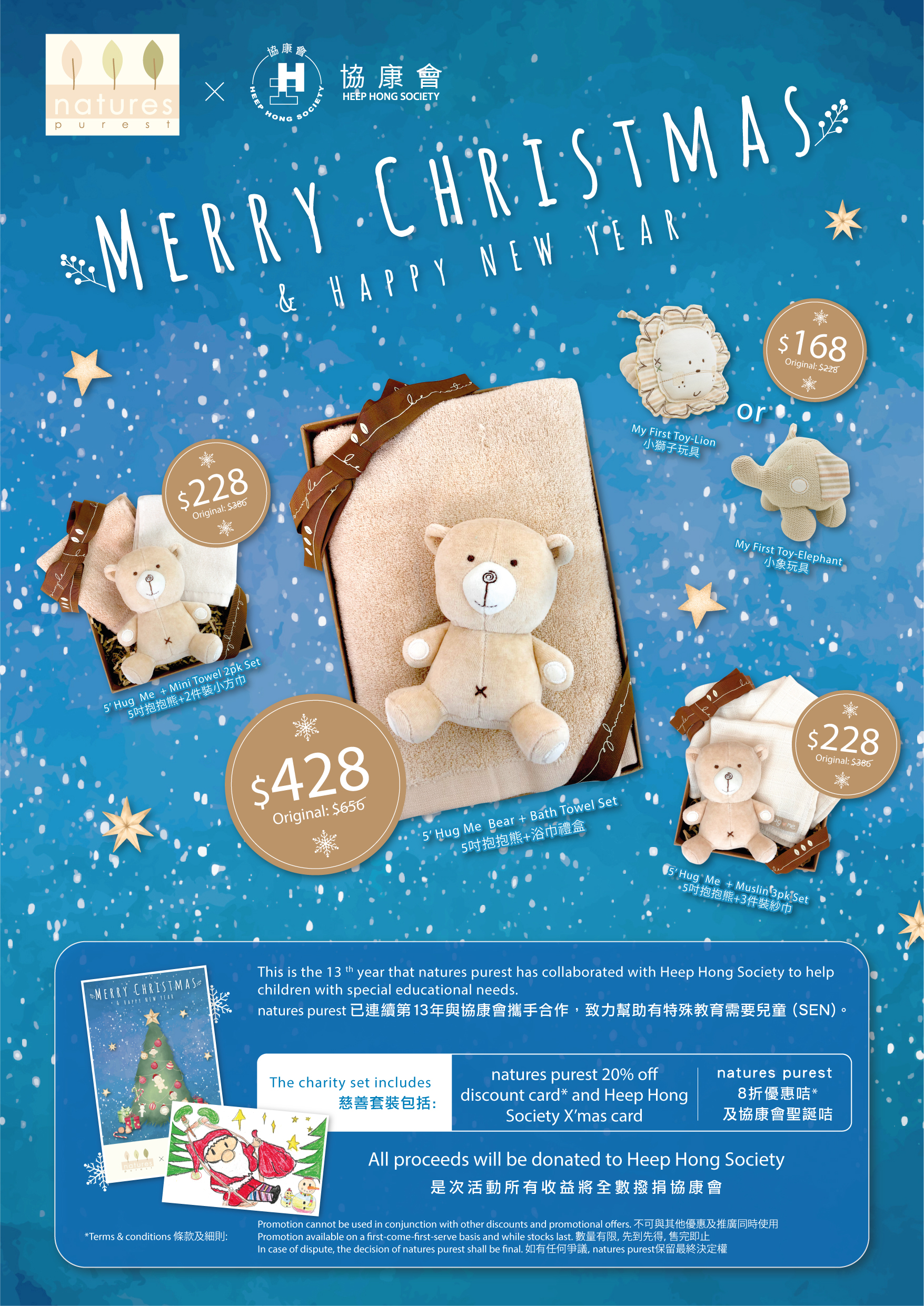 隨套裝更附送由本會學童繪畫的聖誕賀卡及natures purest八折優惠卡。慈善套裝在2020年12月1日至31日期間,於以下natures purest門巿發售。數量有限,售完即止。