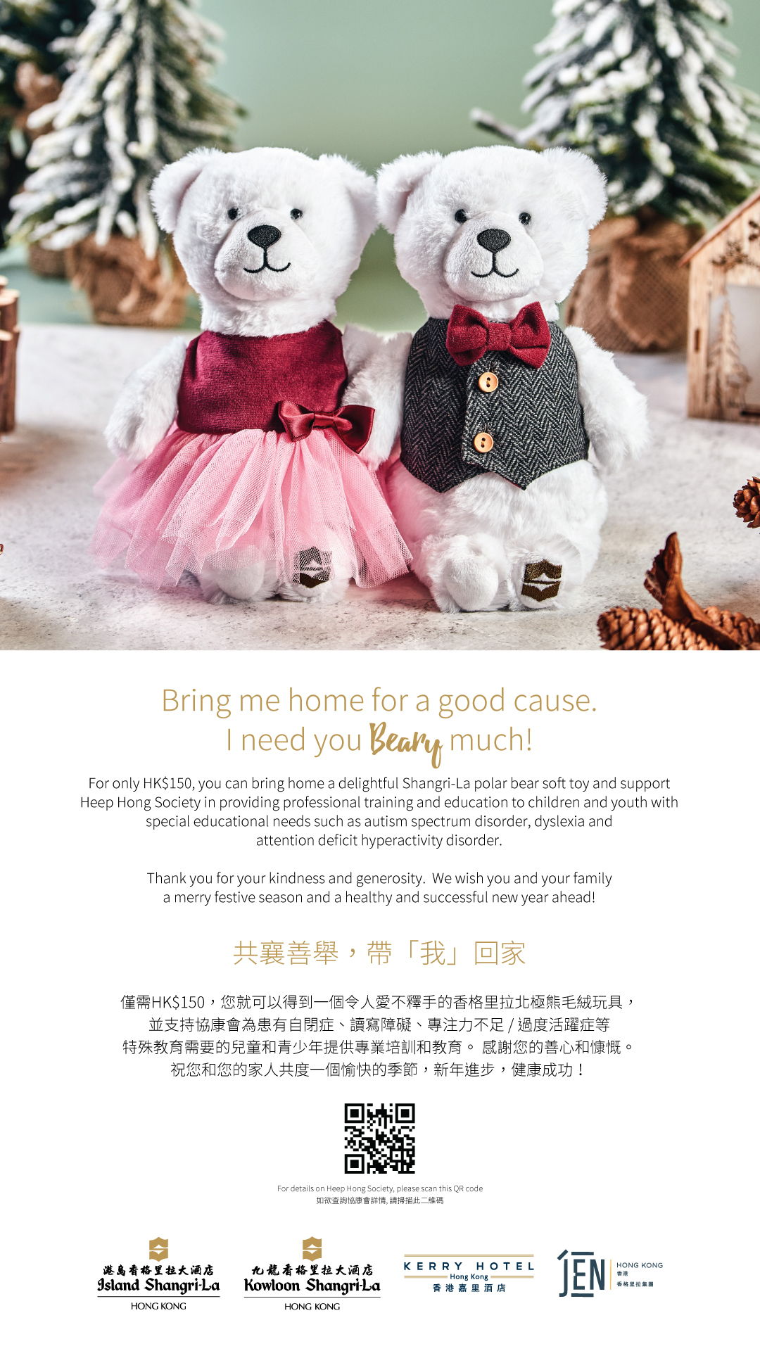 僅需HK$150,您就可以得到一個令人愛不釋手的香格里拉北極熊毛絨玩具,每隻高25厘米,有熊仔仔及熊女女任君選擇。即日起歡迎於港島香格里拉酒店、九龍香格里拉大酒店、嘉里酒店或香港今旅酒店選購。你亦可以透過協康會網上商店或轄下各中心訂購。