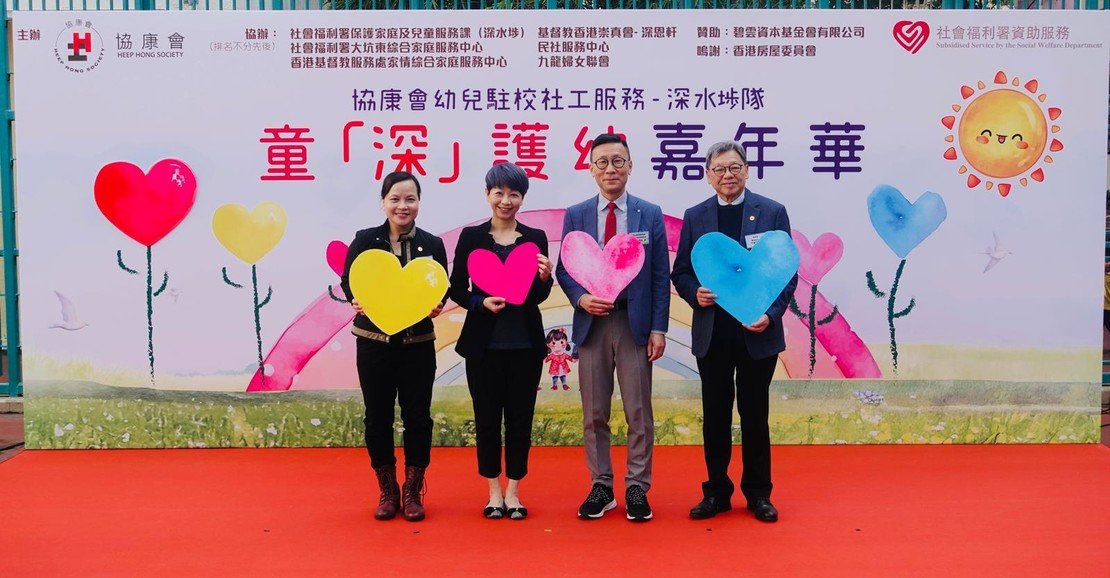 本會的幼兒駐校社工服務 – 深水埗隊,上周六(2月15日)於石硤尾邨足球場舉辦「童『深」』護幼嘉年華」,深水埗民政事務處深水埗民政事務專員黃昕然先生, JP及社會社福利署深水埗區福利專員馬翠蓉女士擔任主禮嘉賓。協康會董事會主席尹錦滔博士及行政總裁梁惠玲女士亦到場支持。