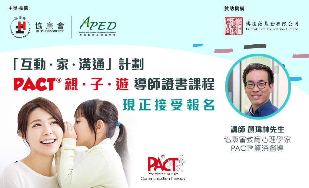承蒙傅德蔭基金有限公司撥款贊助,協康會在香港推出PACT® 「親 ‧ 子 ‧ 遊」導師證書認證課程,訓練導師推行PACT® 「親 ‧ 子 ‧ 遊」療法。