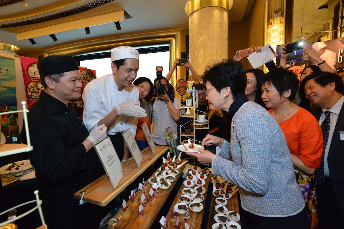 大會邀得香港特區政府政務司司長林鄭月娥女士擔任榮譽嘉賓,並聯同香港君悅酒店總經理俞小俊先生、太子珠寶鐘錶集團副主席及執行董事鄧宣宏雁女士、協康會執行委員會主席歐陽卓倫醫生、協康會總幹事曾蘭斯女士、「全港廚師精英大匯演」工作小組主席何美鳳女士及副主席林李天恩女士、一同為活動揭開序幕。典禮後,司長到訪本會的義賣攤位,欣賞由本會自閉症青年學員及家長製作的「Star Patisserie曲奇」、中心家長製作的皮革手袋及飾物,並與在場的學員、家長和賓客交流。
